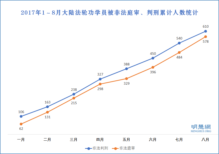 至此,二零一七年一至八月,中国大陆至少610名法轮功学员被非法判刑。由于中共严密封锁信息,这只是根据明慧网通讯员突破网络封锁报道出的案例统计。