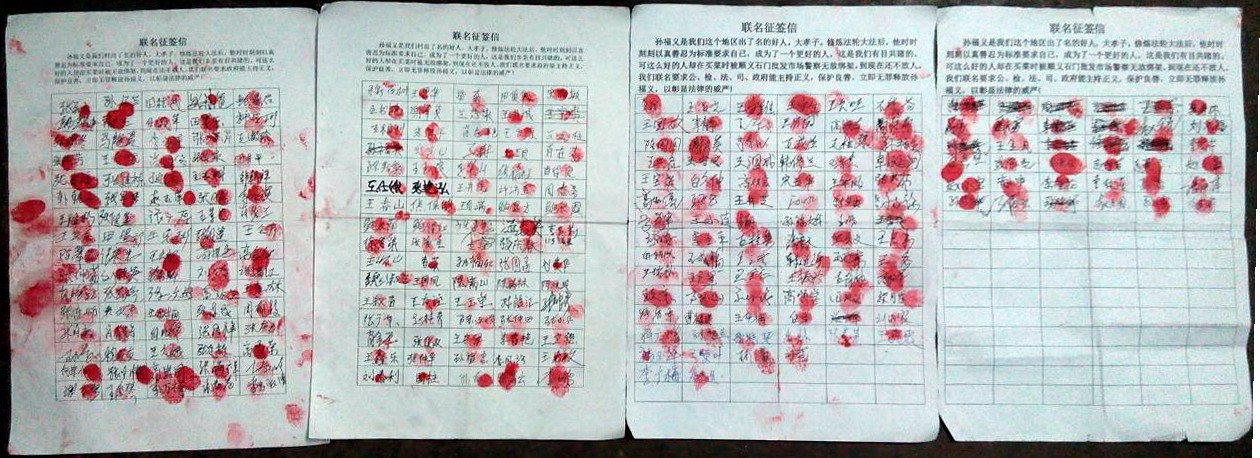 家人为了营救孙福义,找乡亲们作证他是个好人,在很短时间内就征集了二百七十八位乡邻签名按上了红手印,并写出多份证明他是好人并要求释放他的请愿书。