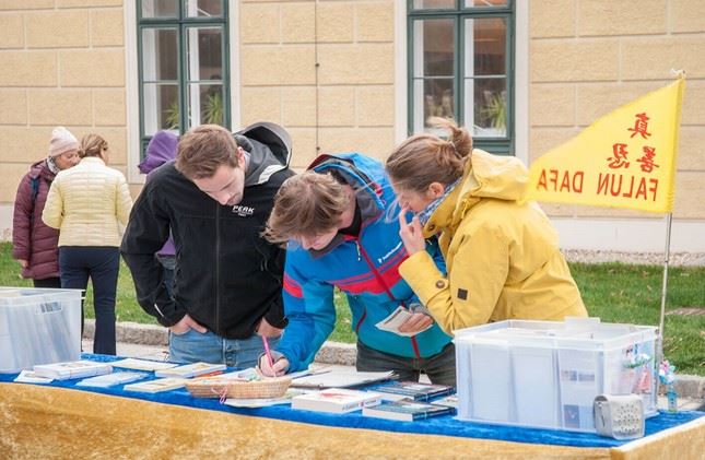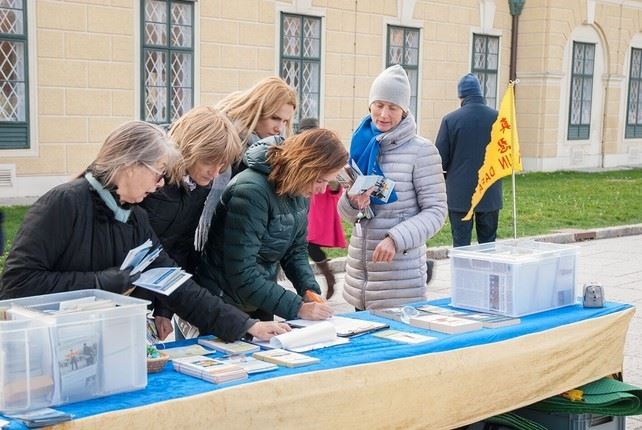 ![]() 图1-2:法轮功学员在维也纳著名景点Schoenbrunn举办信息日活动,征集反迫害签名 |
