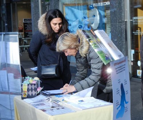 今年九月份,第十四届国际器官捐献大会在瑞士日内瓦国际会议中心举行期间,瑞士法轮功学员曾在会场前举行活动,揭露中共活摘法轮功学员器官的反人类罪行。当地电视台曾经在活动现场进行了采访报道。今天有不少路人表示,他们曾经在瑞士电视节目中知道了相关信息以及当时法轮功学员举行的活动,今天他们直接签名表示支持法轮功学员的反迫害行动。