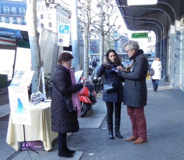 【明慧网二零一七年十二月十四日】二零一七年十二月十三日,又逢一个日内瓦集市的日子。瑞士法语区部份法轮功学员再次来到集市的入口处设立了摊位,向人们介绍法轮功,并揭露中共残酷迫害法轮功学员,甚至活摘法轮功学员器官牟取暴利的反人类罪行。