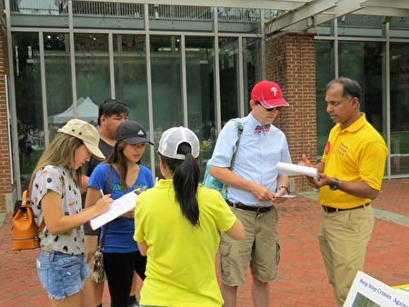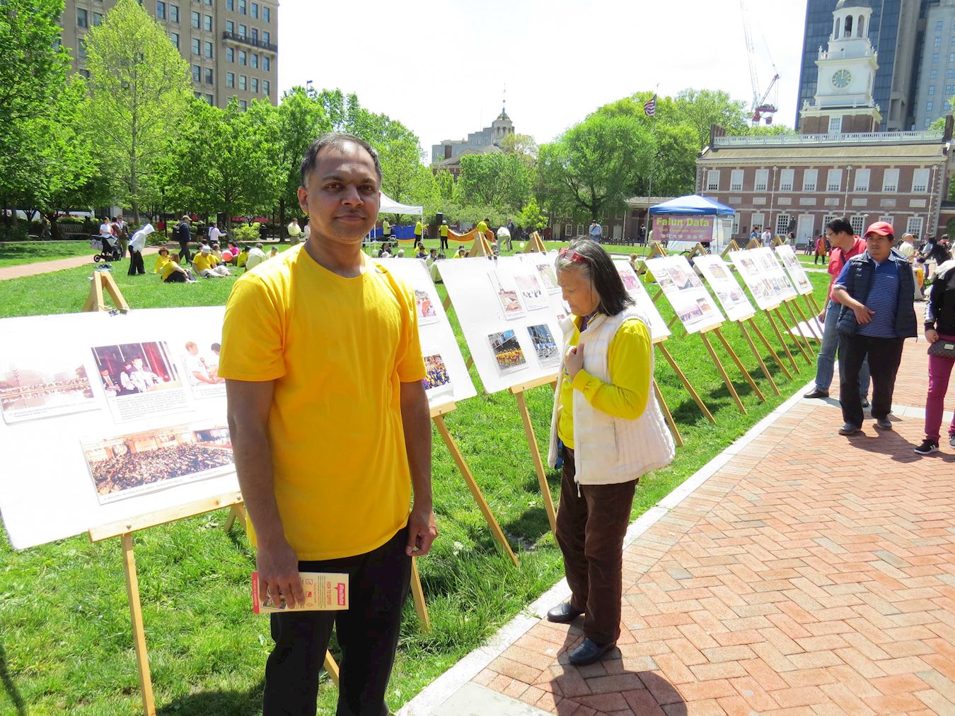 ![]() 图1:在接触法轮功一年之后,Santhosh到费城自由钟景点参加集体炼功 |