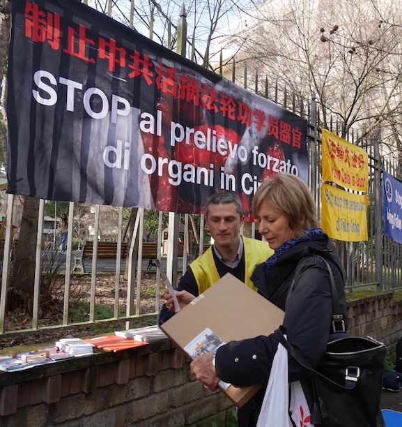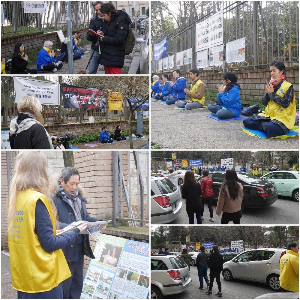 【明慧网二零一七年二月十一日】(明慧记者容法报道)二零一七年二月八日,意大利罗马中共使馆前,法轮功学员揭露中共活摘法轮功学员器官的罪恶,民众支持法轮功学员反迫害。