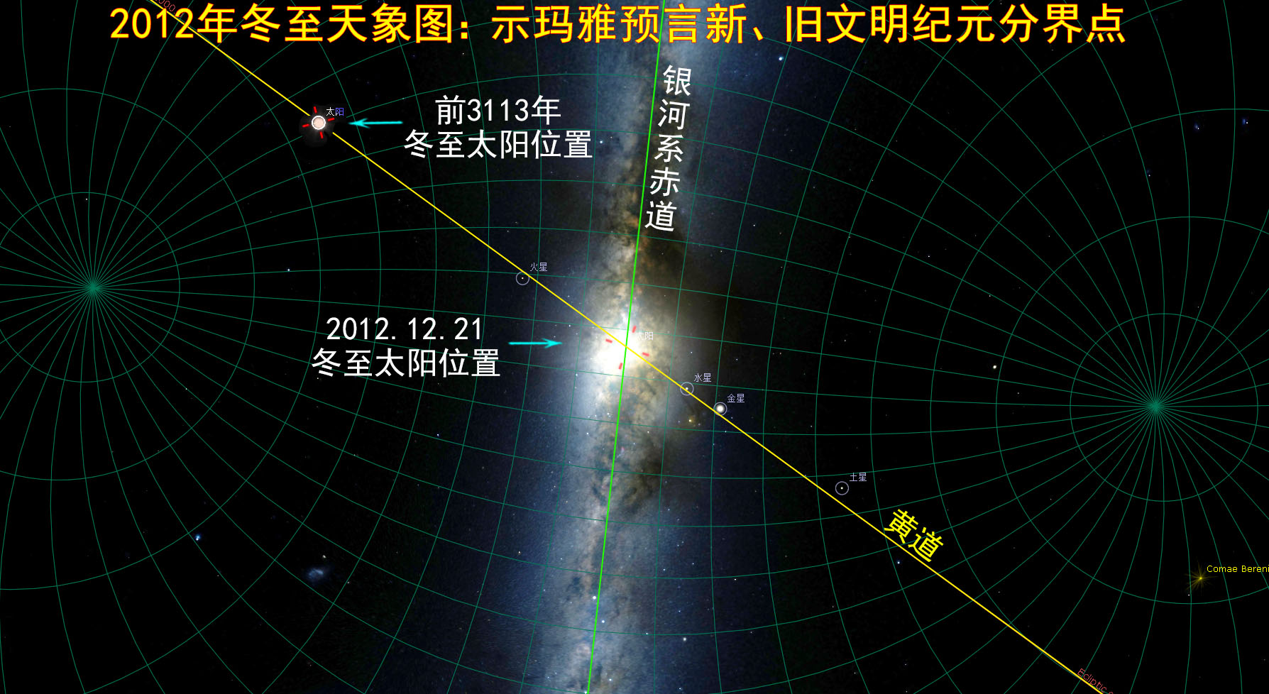 古玛雅文明的天文学,发达的令人瞠目结舌,他们的月亮神庙准确地画着月球背面的图像,那是在地球上永远无法看到的[1],独特并行的3种天文历法(其中一种外星人历法),精准的天文学计算,让人类无法不重视古玛雅文明留下的预言。玛雅文化认为本次人类文明始于公元前3113年(当年冬至[2]太阳的位置如图),终结于2012年12月21日冬至,这一天,太阳运行到了黄道和银河赤道的交点,这是新旧文明的分界点。