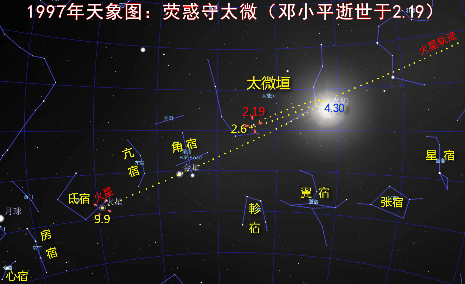 红朝第二代掌权人邓小平,1997年2月19日去世,当天的天象:罚星荧惑顺行守太微。