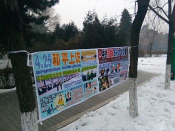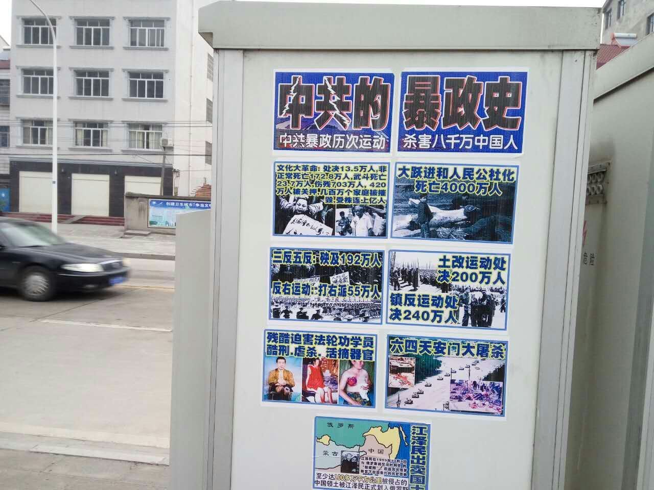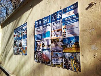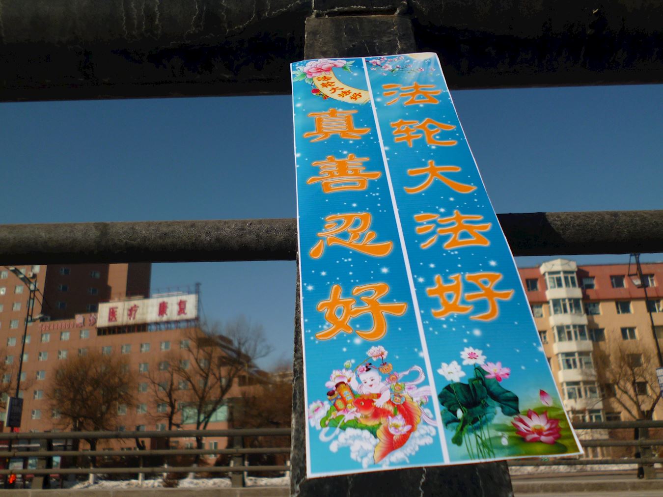【明慧网二零一七年二月十六日】金鸡报晓,新年来到,在中国大陆很多地区,人们都能看到“法轮大法好”、“真善忍好”的条幅、树挂或粘帖,也能看到图文并茂的海报、展板,揭露中共江氏一伙对法轮功的迫害