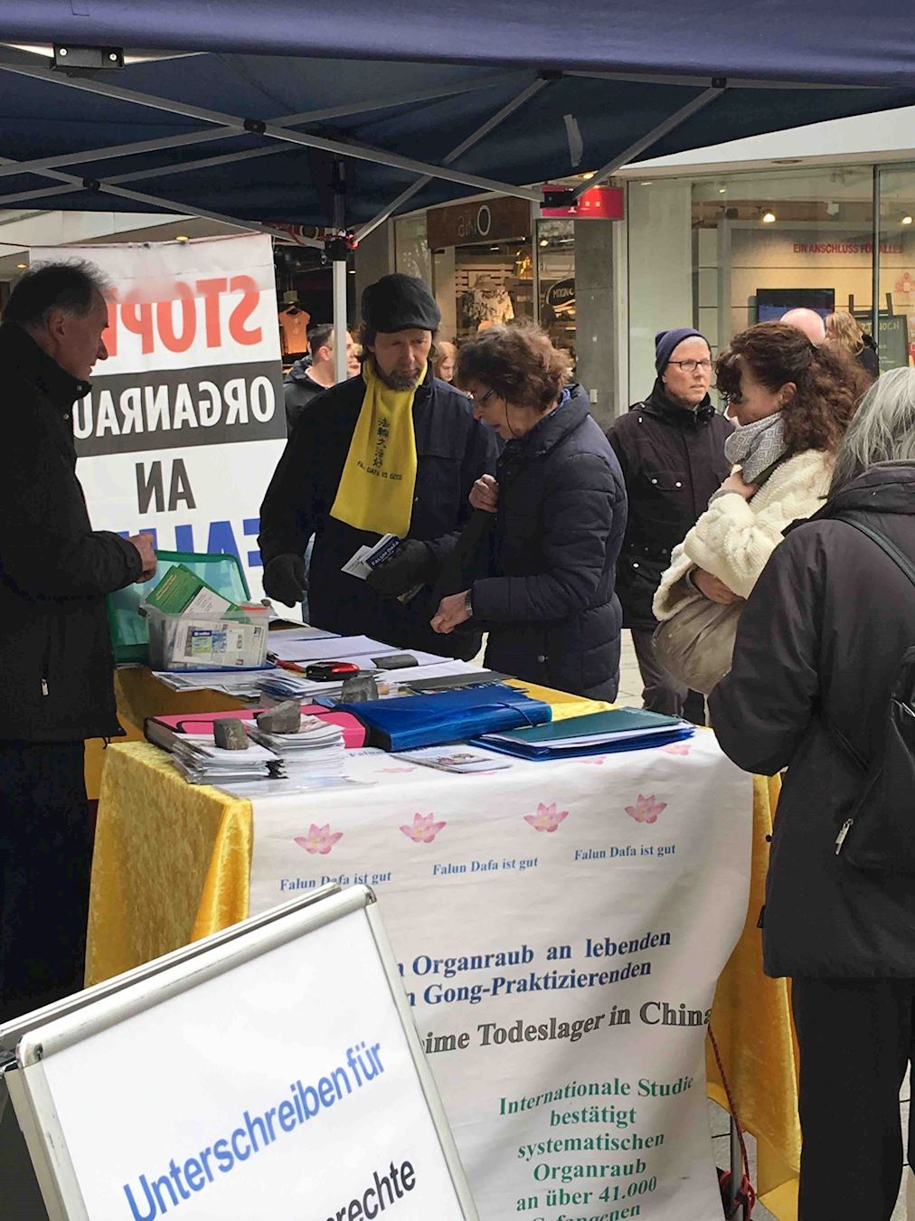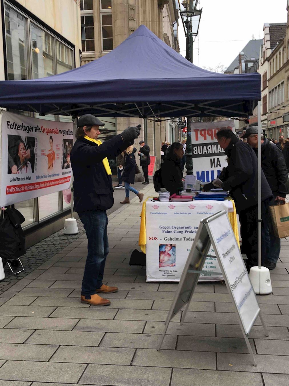 【明慧网二零一七年二月二十四日】二零一七年二月四日,来自德国北威州(Nordrhein-Westfalen)的部份法轮功学员来到州府杜塞尔多夫(Duesseldorf)的老城,举办了一个介绍法轮大法和揭露中共活摘法轮功学员器官的信息日。