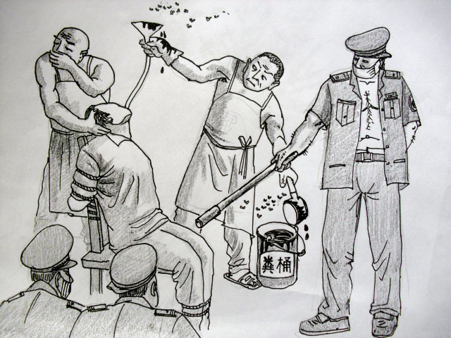 狱警还给郑会旺铐上脚镣、手铐,并用绳子把两种刑具绑在一起,使他只能弓着腰坐着,半伸腿都难;强迫他不停地看诬蔑大法的光盘,声音很大;熬着不让睡觉,合眼就用手击打身体;控制大小便,叫他憋着;把大法师父的名字打印出来塞在他臀部,对他精神折磨。监狱方面用尽了各种手段折磨他,其中还有手铐过紧,把手铐毁掉才打开。