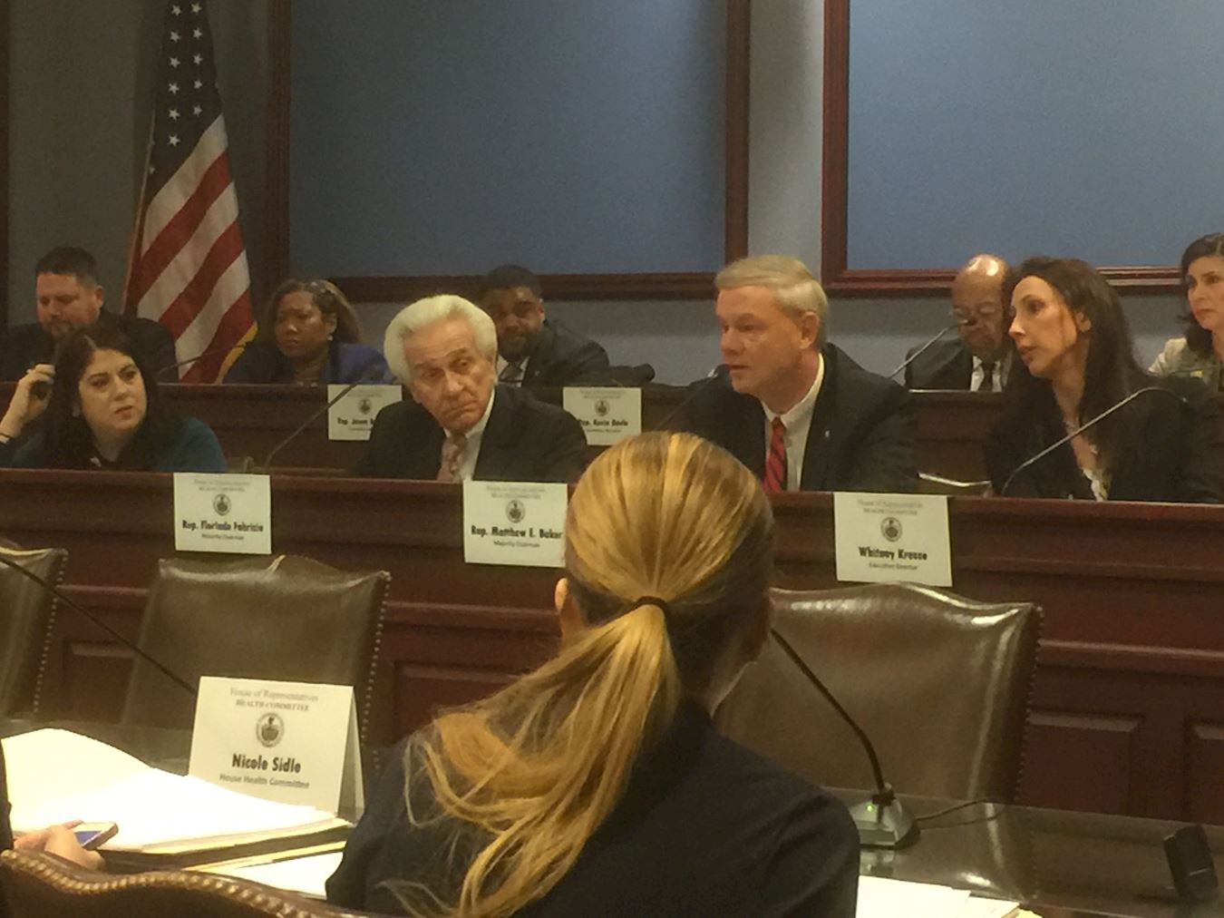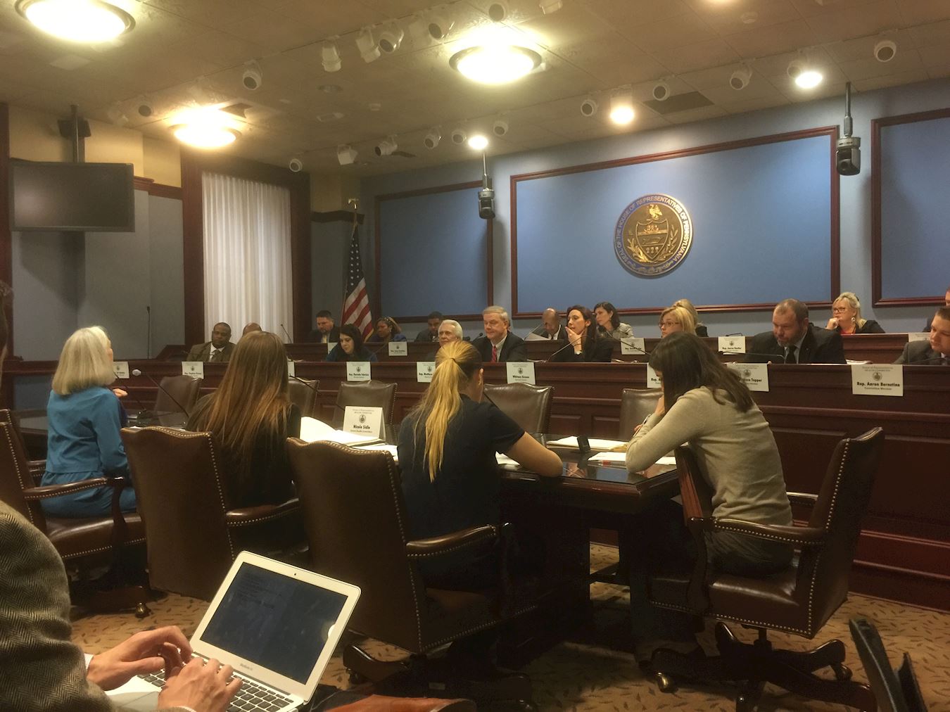 ![]() 图2:大费城地区医生科森(Dr. Ann Corson,前排左一,蓝衣者)在宾州众议院健康委员会听证会上,介绍国际社会调查和制止中共活摘器官的最新情况。 |