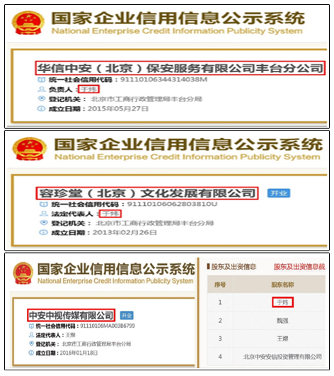 资料显示,华信中安丰台分公司负责人于炜;容珍堂文化发展有限公司法人代表、个人独资于炜;中安中视传媒有限公司股东于炜。即于炜是华信中安丰台分公司的负责人,也是容珍堂美术馆、书画院的实际控制人,这些单位的股东多有交叉,确实是一个利益、工作深度溶合的共同体。
