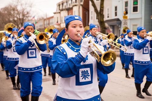 【明慧网二零一七年三月二十三日】(明慧记者程新美国波士顿报道)二零一七年三月十九日,由一百六十多名法轮功学员组成的天国乐团参加了美国波士顿的圣派翠克日游行。身着传统服饰的天国乐团成员,英姿飒爽,鼓乐气势雄壮,成为当日游行活动的亮点,沿途围观民众在天国乐团经过时大声喝彩欢呼。