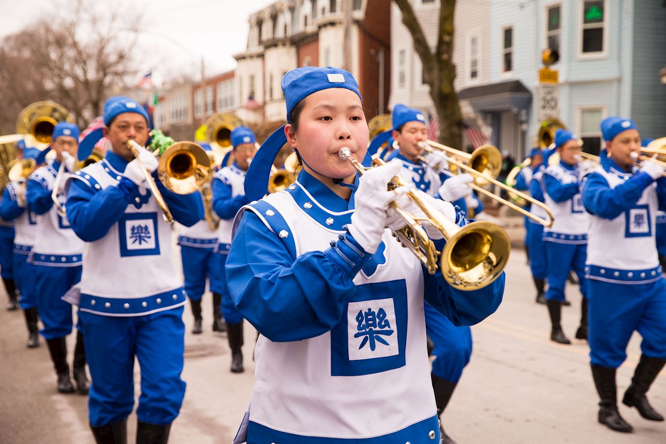 图1~5:由一百六十多名法轮功学员组成的天国乐团,在二零一七年波士顿圣派翠克日游行上展英姿。