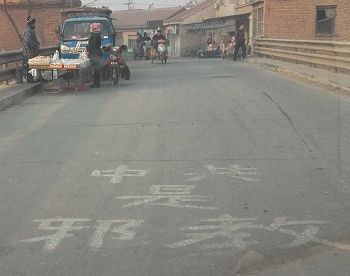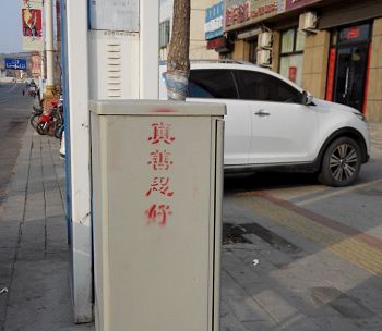 在河北某县与县交界的桥头旁,巡防警察在“真善忍好”标语下执勤,在与其对称的路对面灯杆上是“审判江泽民 还法轮功清白”的标语,警察也在这个标语下执过勤。在近在咫尺的桥面上,还有“起诉江泽民”、“中共是邪教”大型地面标语,而且已有二十多天了,灯杆上的真相标语时间就更长了,直到现在还很光亮醒目。