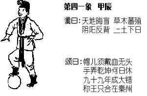 谶曰:一传二,十传百,万传亿,法轮功修炼者脱土离俗,心向真善忍。法轮大法度化众生,天下垂拱而治。
