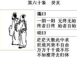 六十象:谶曰:阴阳太极图象日月的运转,无终无始。认同“雕嘴”诬陷诽谤者,灾难之日命终,认同(天罡)法轮大法者,自然始入新纪元。