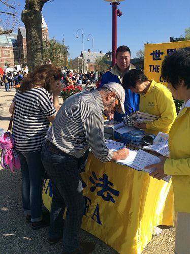 【明慧网二零一七年四月十一日】荷兰国立博物馆位于荷兰首都阿姆斯特丹市中心,每天都有大量的世界各地的游客来到博物馆参观。二零一七年四月八日和九日,荷兰部分法轮功学员在博物馆前的广场上举行了弘扬法轮大法、讲清迫害真相及揭露中共活摘器官的活动。