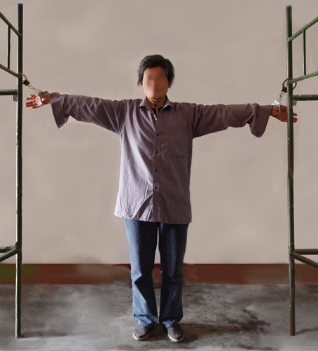 一到三大队,指导员马丰平和队长陈杰,因我不配合劳动亲自将我两臂铐在监室铁架双人床上成“十”字形站立,从凌晨四点一直站到深夜零点,两腿站的红肿、疼痛难忍,两臂被架的又痛又酸、头晕目眩,五天后,又被按在地上强行灌食,又强行给我穿上了“约束衣”。就这样断断续续被迫害了一年。