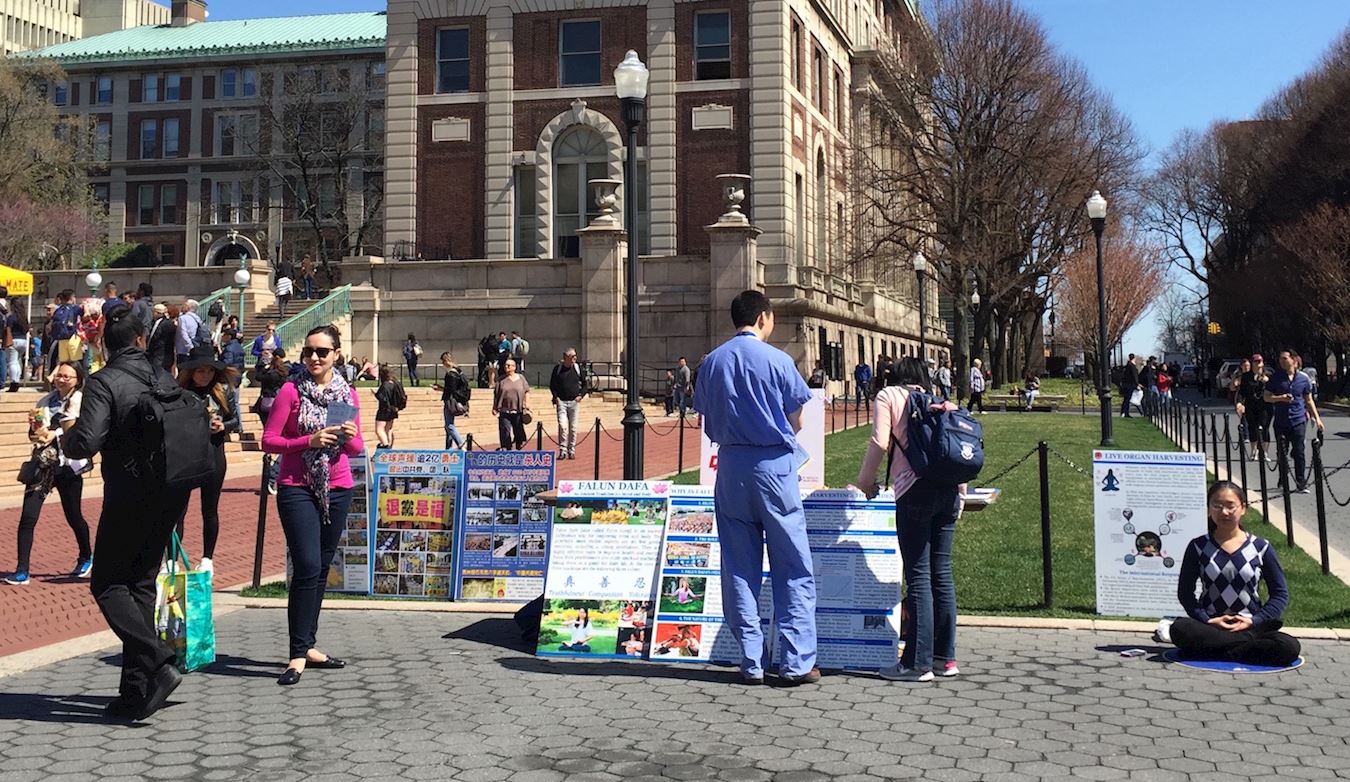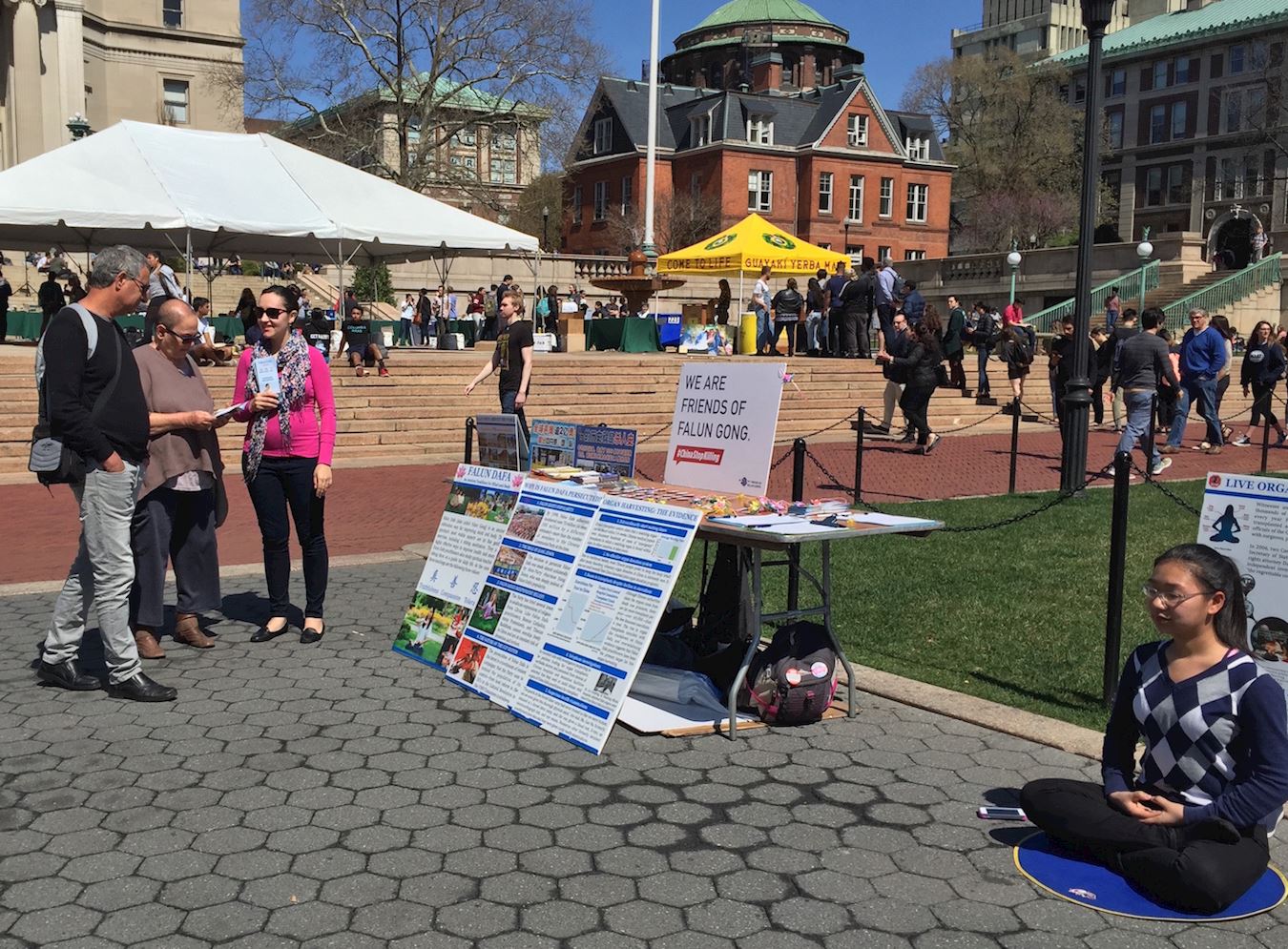 二零一七年四月四日,阳光普照,哥伦比亚大学法轮大法学生社团在校园中心广场,开展了为期两日的讲真相活动。学员们向哥大的学生、教师及各国游客展示法轮功功法,派发真相传单。