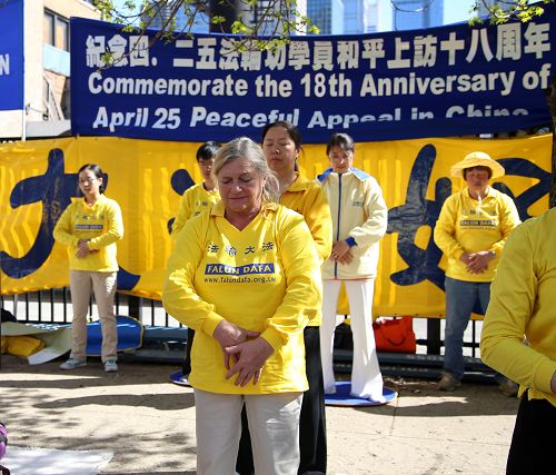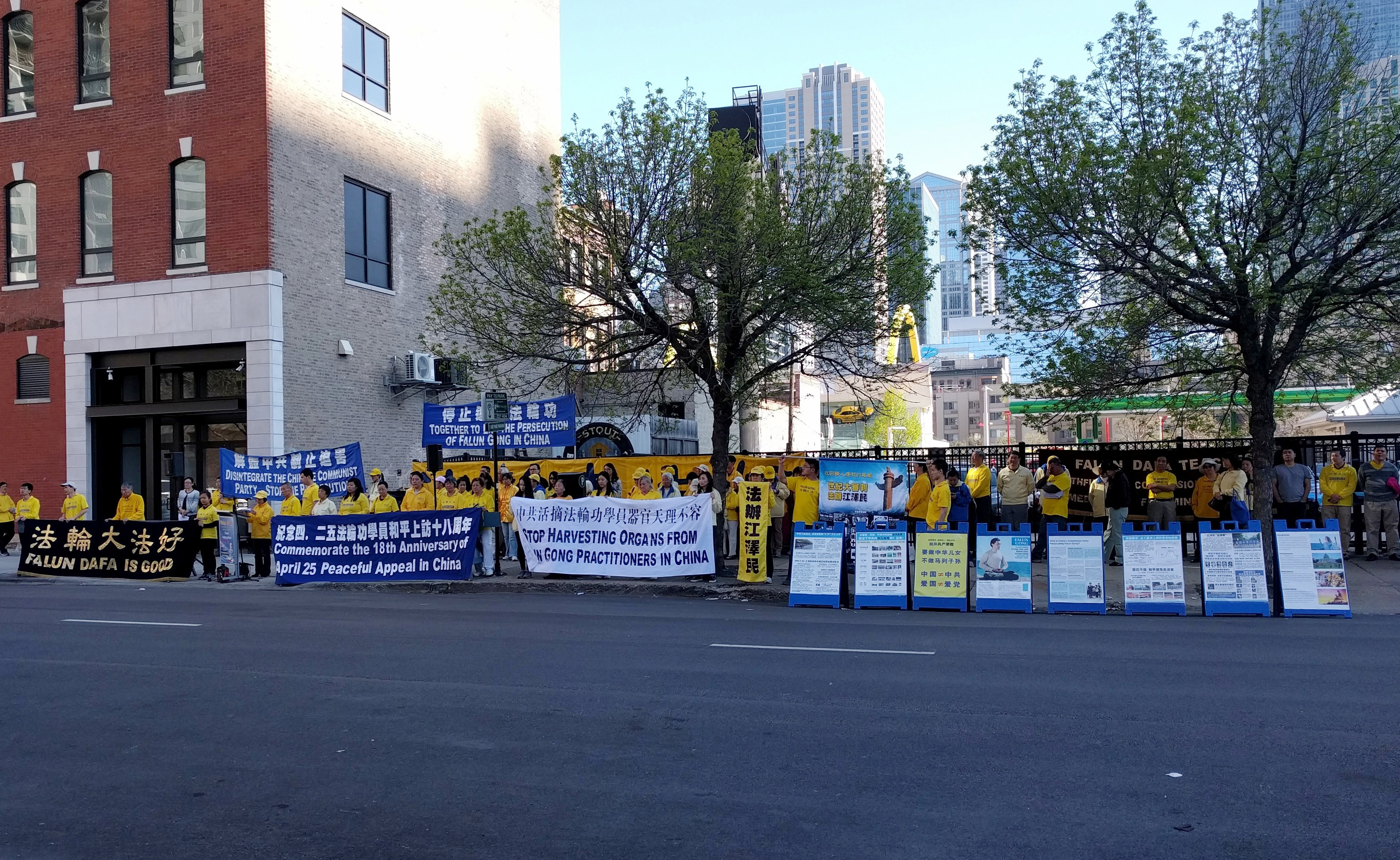 下午三点,来自芝加哥及周边地区的法轮功学员聚集到芝加哥中领馆前,开始集体炼功。他们打出“纪念四二五法轮功学员和平上访十八周年”、“法轮大法好”、“停止迫害法轮功”、“法轮大法教人真、善、忍”、“解体中共,制止迫害”,“中共活摘法轮功学员器官天理不容”等中英文横幅和一些真相展版。