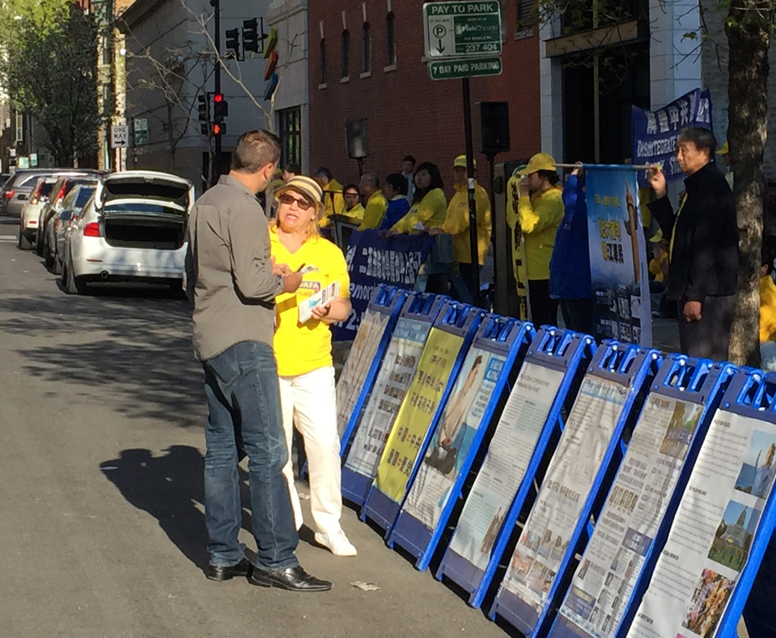 不少行人欣然从学员手中接过传单,对法轮功遭受迫害表示同情,并对学员说“祝你们好运”,也有的驻足停留阅读展板。