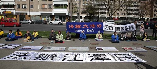 ![]() 图1~2:波兰法轮功学员在华沙中使馆门前和平请愿,纪念“四二五”十八周年。 |