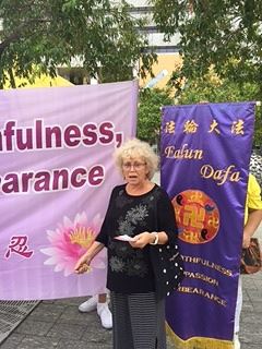 来自南澳首府阿得雷德市的玛丽娅(Marja-Liisa)女士说:我在伦敦时就看到法轮功学员每天二十四小时在中共使馆前静坐、炼功,我非常钦佩法轮功。我强烈反对中共当局对法轮功的迫害,特别是活摘他们的器官,这些罪行必须被制止。
