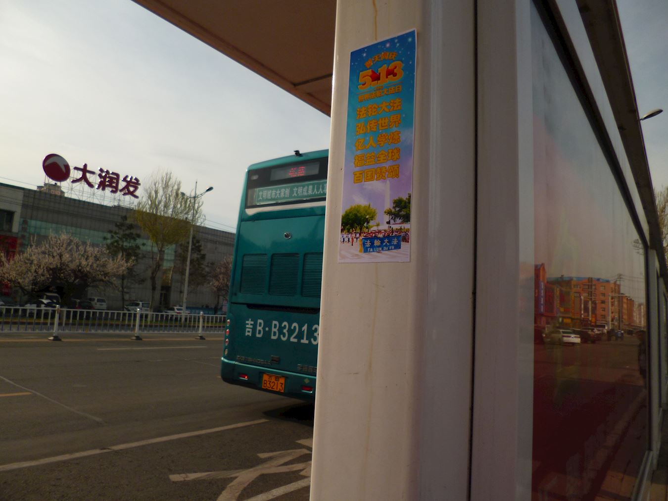 4.25期间吉林市法轮功学员向世人展现法轮功真相展板、树挂和粘贴