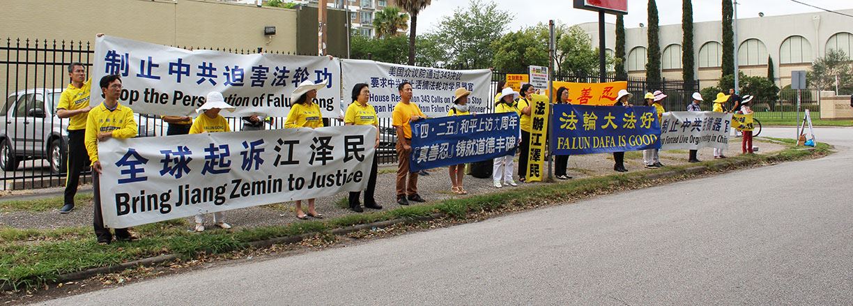 四月二十五日上午九点,法轮功学员在位于蒙确大道(Montrose Blvd)中领馆前和平集会,学员手持中英文横幅:“法轮功 真善忍”、“法办江泽民”、“停止迫害法轮功”、“纪念四·二五和平上访十八周年”等。