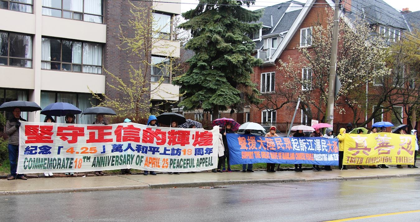 二零一七年的同一个日子,为纪念这一壮举,并向媒体和主流民众讲清法轮功真相,多伦多法轮功学员举行了系列的纪念活动:中午一点至两点,在中领馆前召开新闻发布会,纪念四二五和平请愿壮举,并揭露中共谎言和迫害;下午三点半至六点,在市中心的St George 和 Bloor,法轮功学员拉起横幅,筑起真相勇气长城,向民众讲真相;晚上八点至十点在中领馆前举行烛光悼念,缅怀十八年来因为修炼法轮功而在中国受迫害致死的法轮功学员。现场的肃穆和祥和,令民众震撼,警察赞赏,华人“三退”。当地华人媒体新时代电视(Fairchild TV)做了详细的采访。