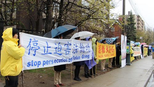 来自于牙买加的私人护理(Personal Support Worker)Marline Frazer女士在活动现场停下脚步,并长时间的听着法轮功学员在中领馆前的发言。