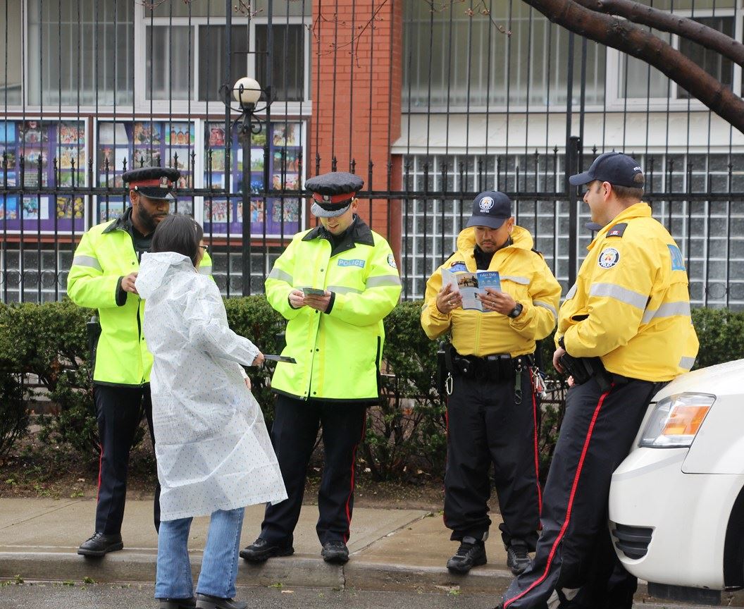 法轮功学员听后表示谢谢他们并告诉他们在中国情况正好相反,如果你修炼法轮功的话,就会被中共的警察抓捕入狱,就像真相传单上这张照片一样。警察们拿着真相传单阅读起来了。