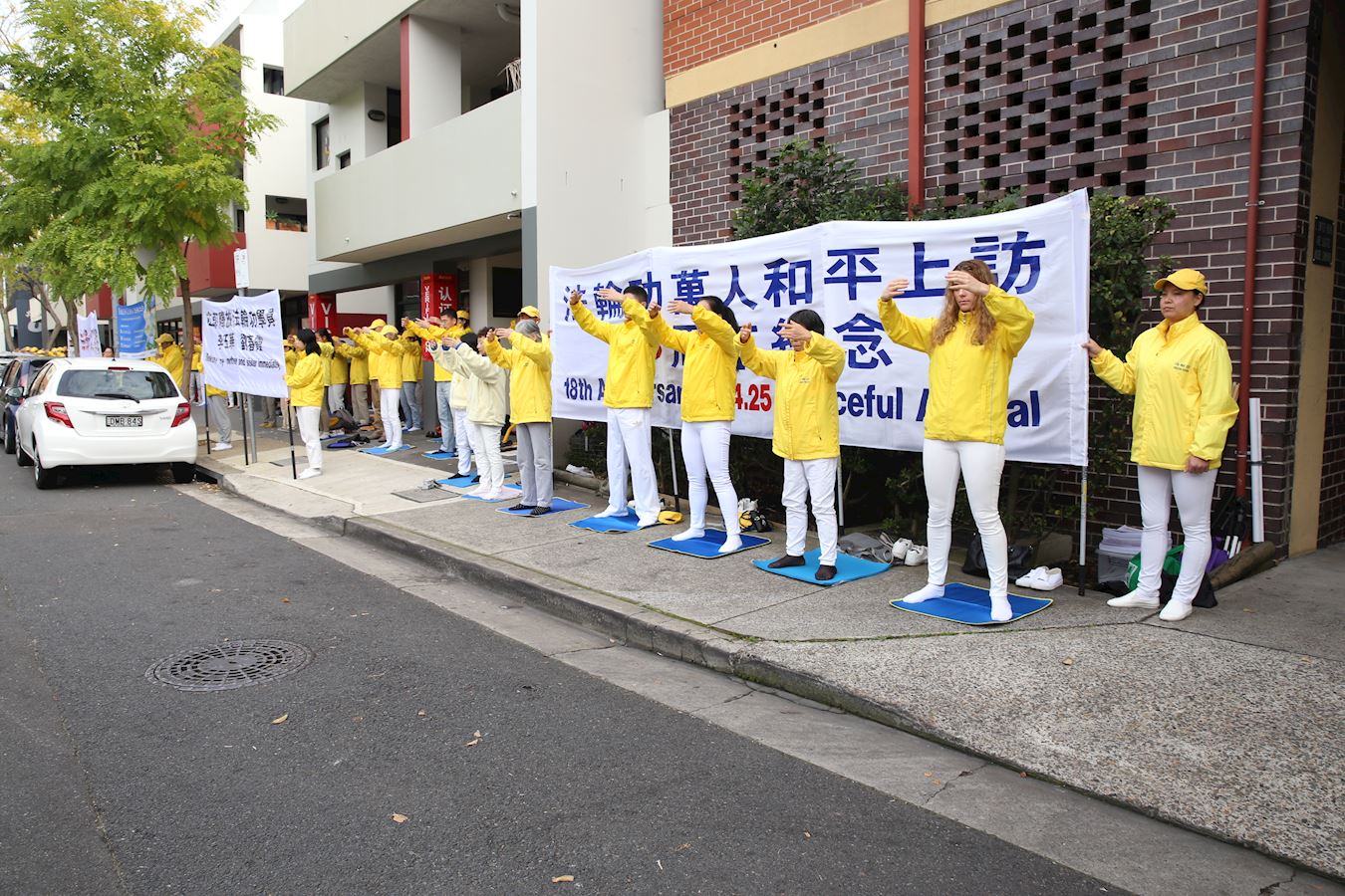 '图1~2:纪念“四二五”十八周年,悉尼法轮功学员在中领馆前和平请愿,呼吁制止迫害。'
