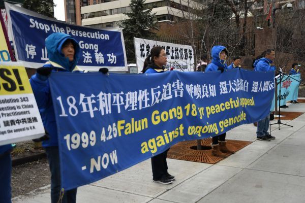 图1~2:卡尔加里法轮功学员在中领馆前集会,纪念“四二五”和平抗争十八周年。
