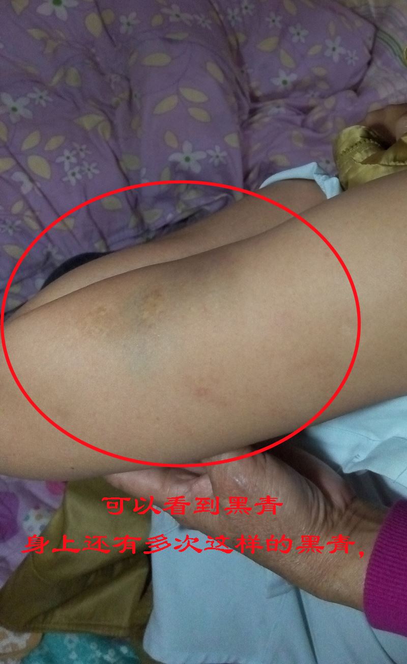 法轮功学员洪美芳回到家后,发现自己身上多次黑青。