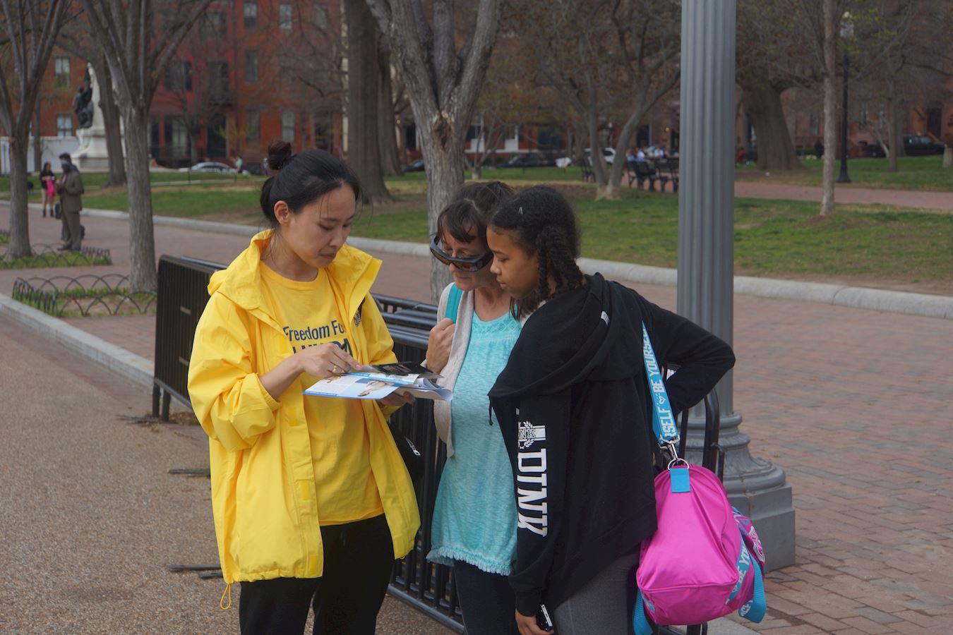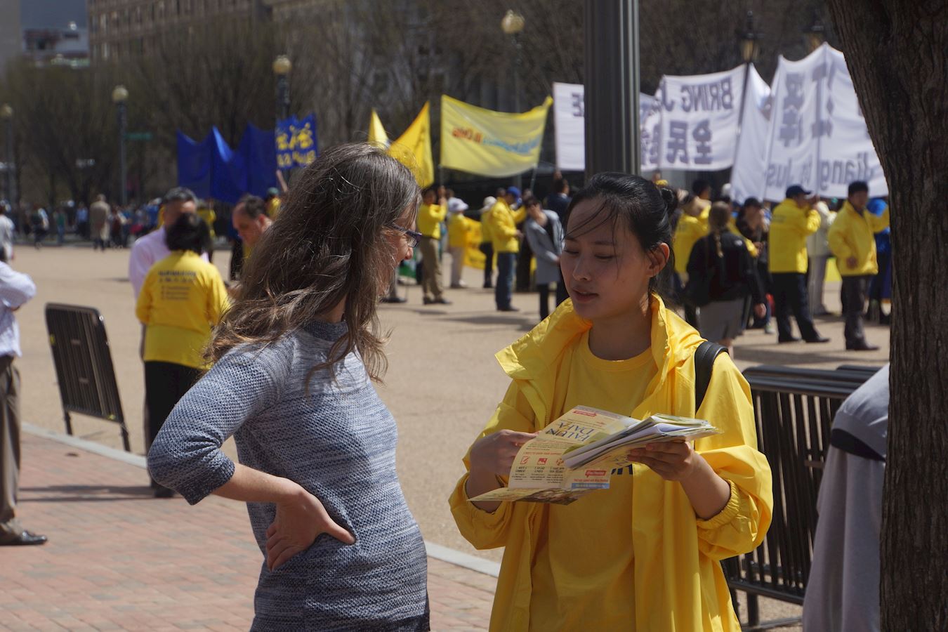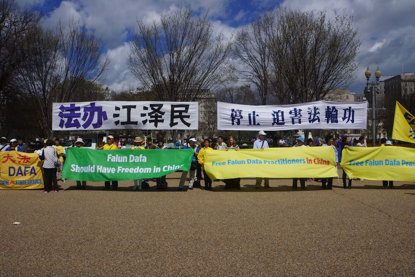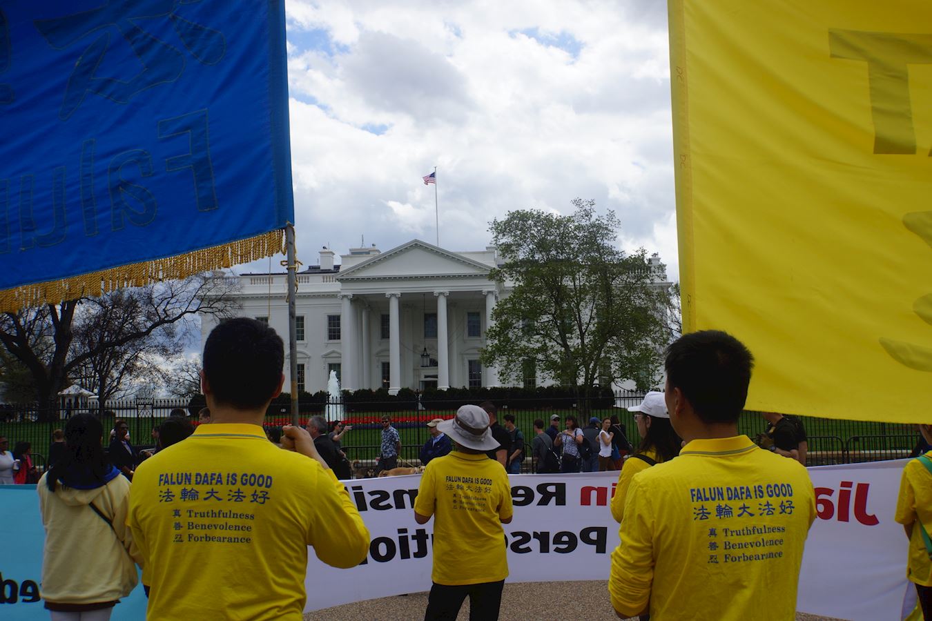二零一七年四月四日中午,在白宫正门外,法轮功学员手持横幅,传递真相,表达诉求。