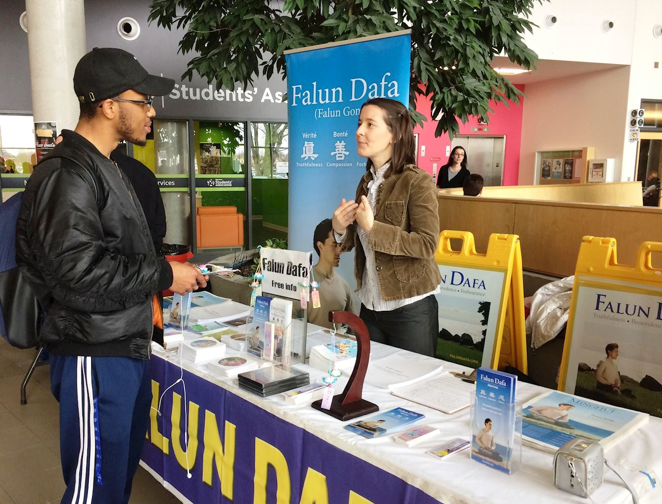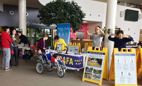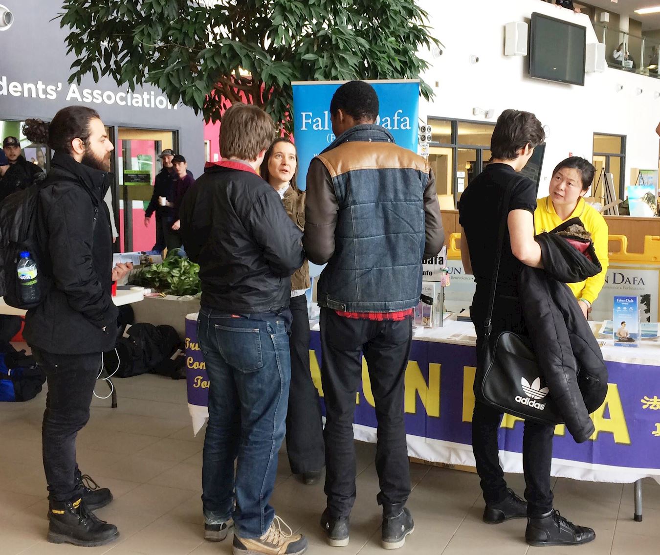 【明慧网二零一七年四月九日】(明慧记者英梓渥太华报导)二零一七年四月五日下午,部份渥太华法轮功学员在当地的亚岗昆大学(Algonquin College)学生活动中心(Students Commons)举行了讲真相活动,向该校的师生演示了法轮功的五套功法,并曝光中共在中国大陆对信仰真、善、忍的法轮功学员的迫害