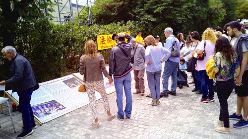 路过的游人纷纷前来观看学员们炼功,更多的游人则是在观看展板了解真相。一位绅士主动跟学员要了张真相单,了解真相后,在请愿书上签名支持法轮功学员。他对学员讲,很高兴能在这里看到你们,在哪里能够找到你们的炼功点?表示要来学炼法轮功,经过学员的详细介绍后,才欣慰地离开。