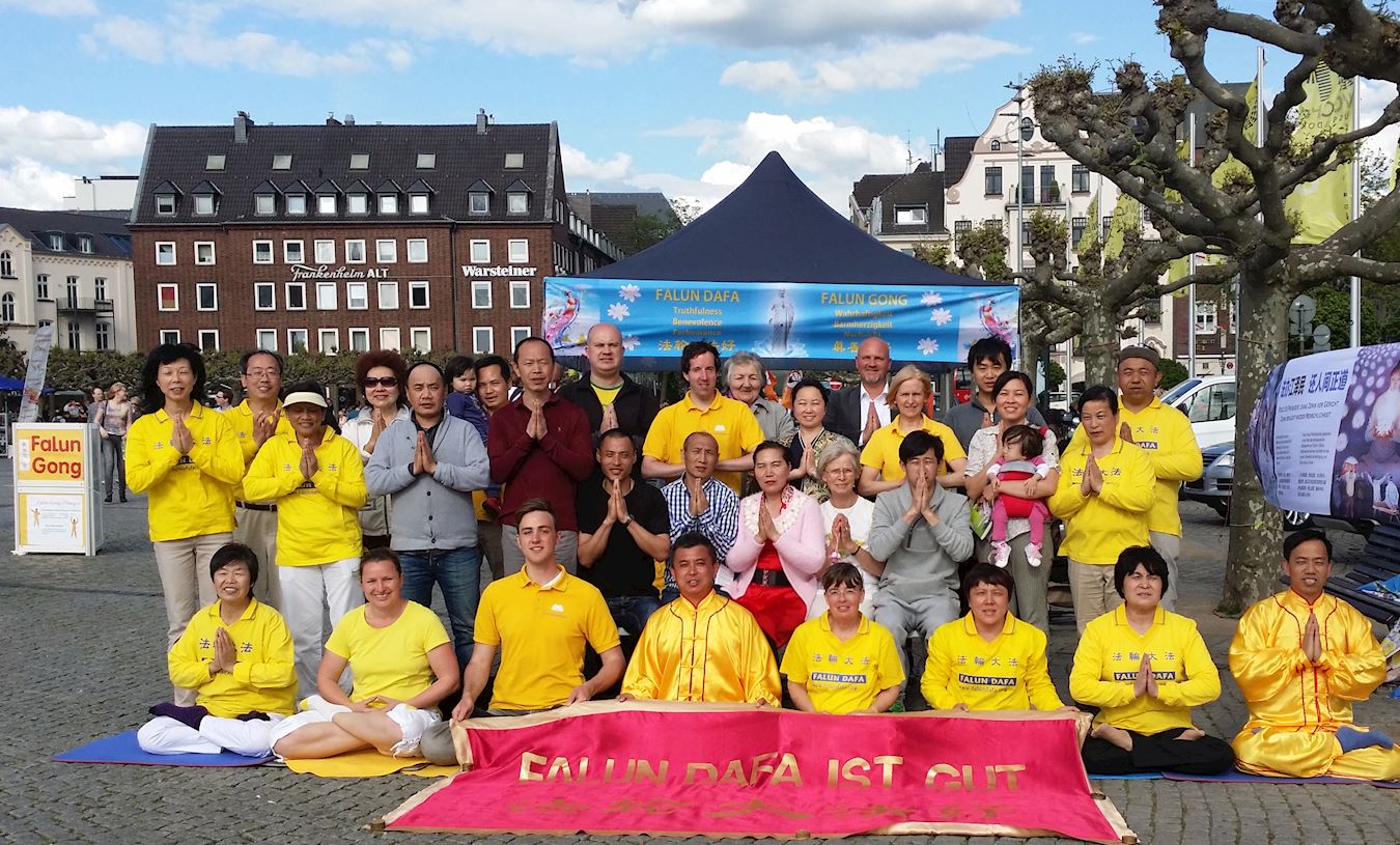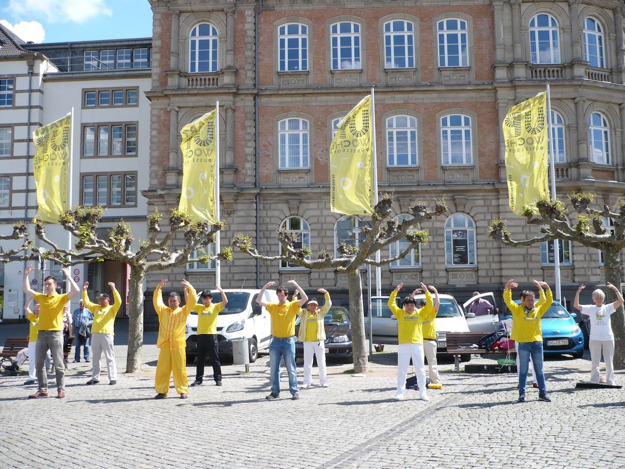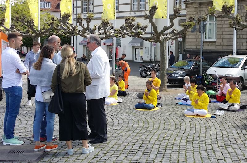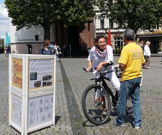 ![]() 图6:杜塞尔多夫市民停下自行车了解法轮功 |