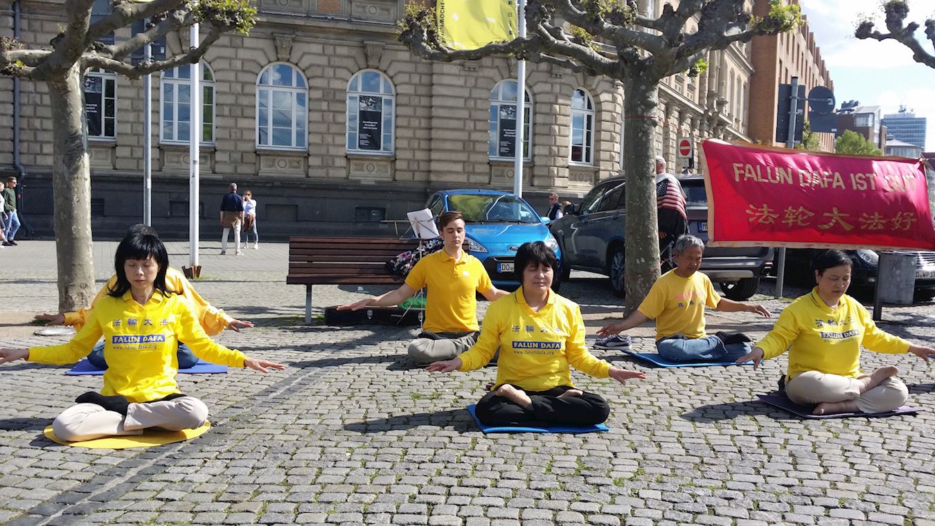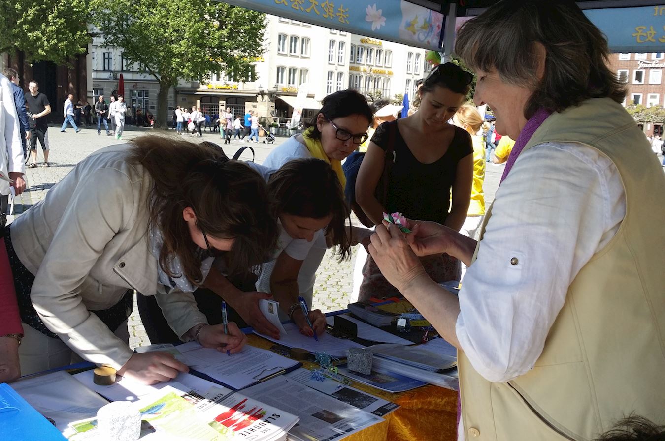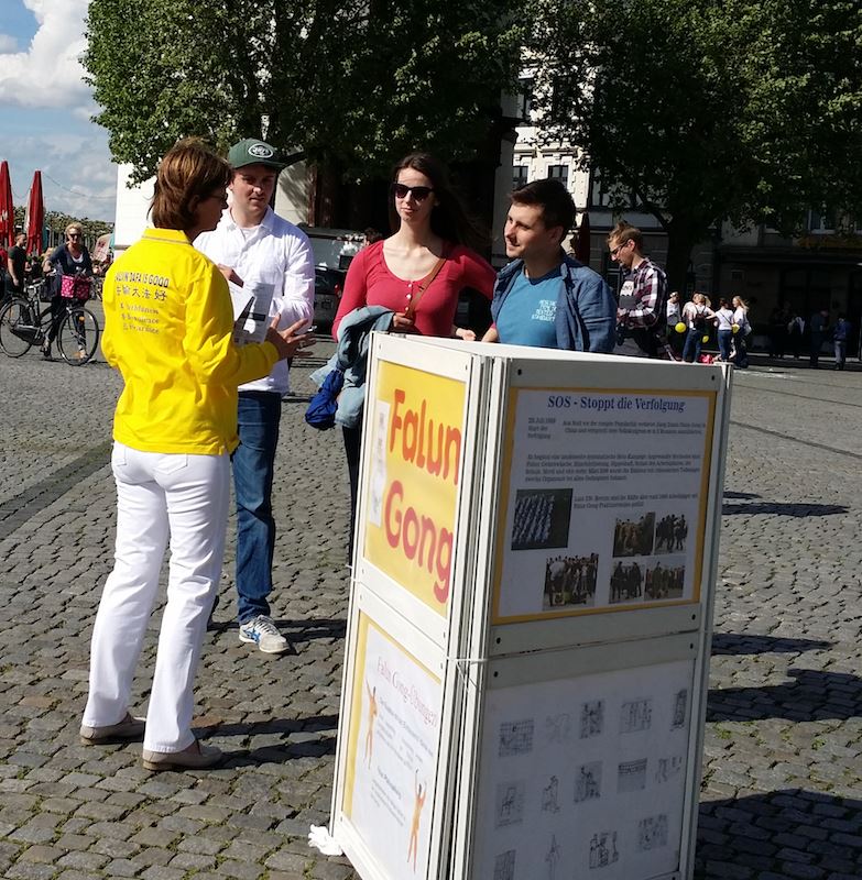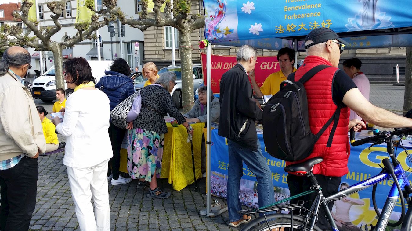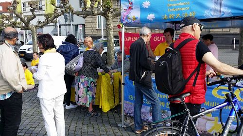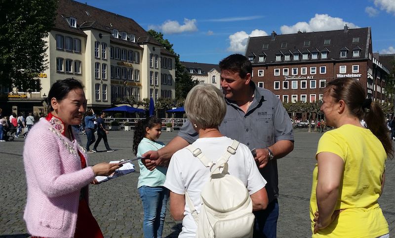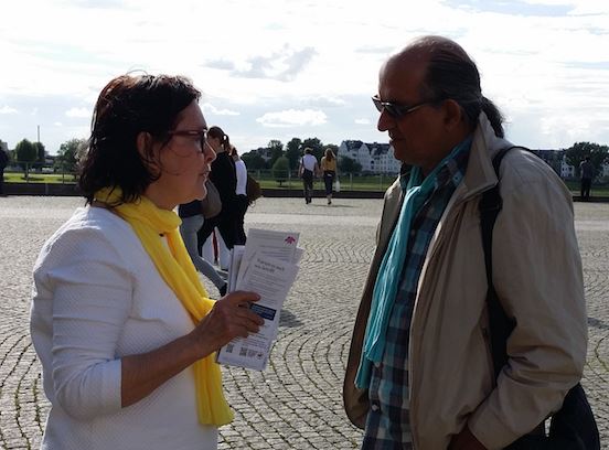 ![]() 图3:德国民众在了解法轮功真相 |
