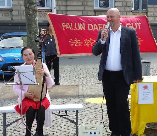 ![]() 图4:主持人向民众介绍法轮功学员演奏的琵琶曲目 |