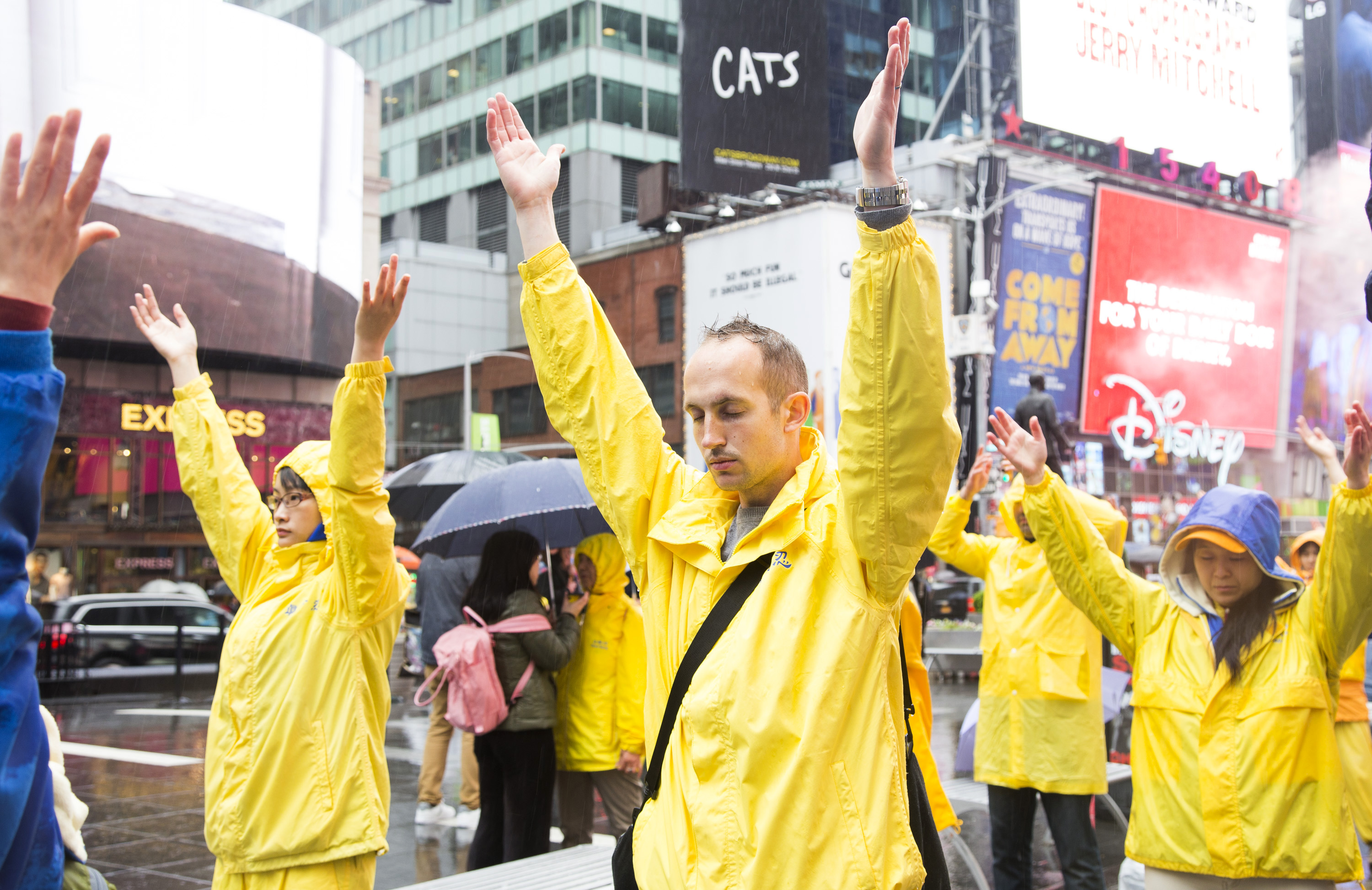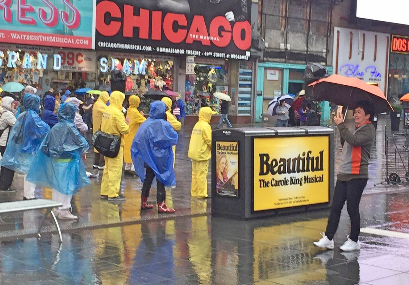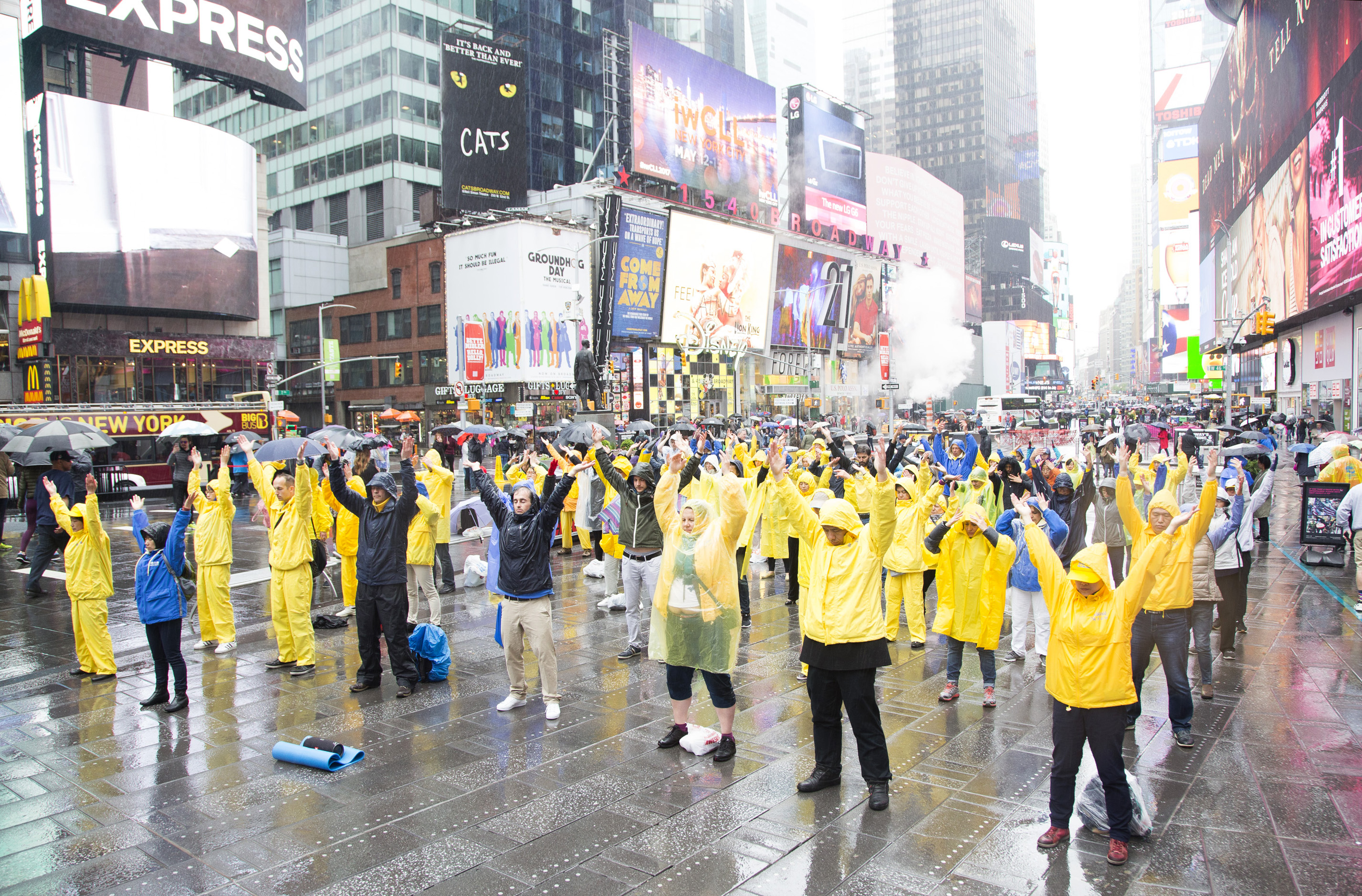 图1-3:二零一七年五月十三日,近百名法轮功学员冒雨在纽约时代广场上集体炼功,传播法轮功的真相。