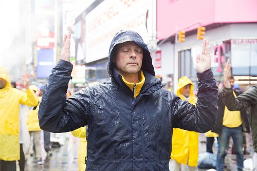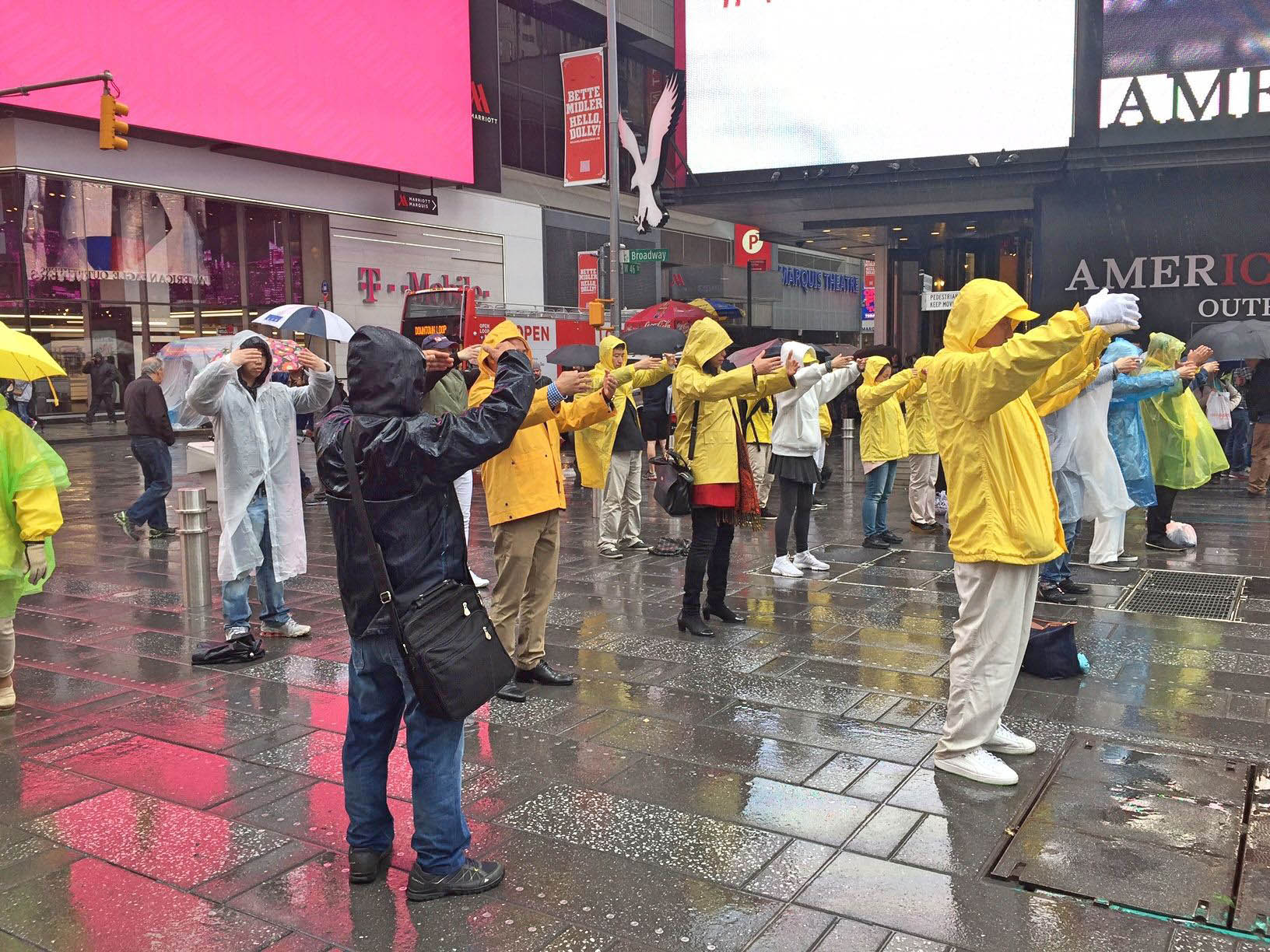 【明慧网二零一七年五月十四日】(明慧记者吴思静美国纽约报道)二零一七年五月十三日上午十点到下午一点,近百名法轮功学员在纽约地标景点时代广场上炼功,向来自世界各地的人们讲述法轮功学员在中国被迫害的真相。尽管下着雨,法轮功学员祥和的炼功场面,吸引了匆匆的路人驻足观看拍照,有的还跟着法轮功学员模仿炼功动作。