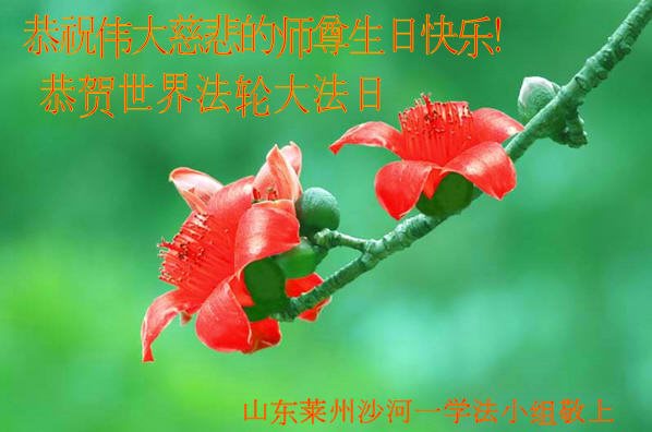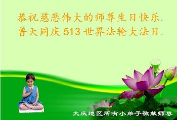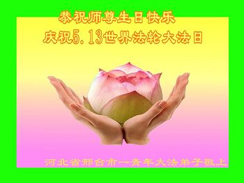 我是法轮大法弟子的子女,这些年来从我的父辈身上见证了法轮大法的美好,他们从一身病体变的健康,待人友善,家庭和睦。在世界法轮大法日到来之际,向李大师问好,恭祝李大师生日快乐!恭贺世界法轮大法日。