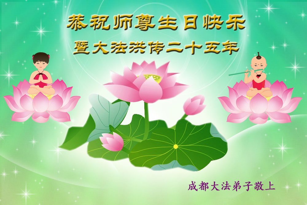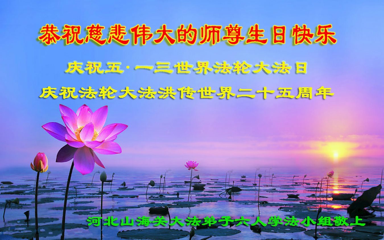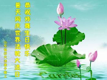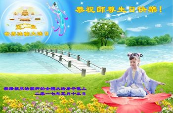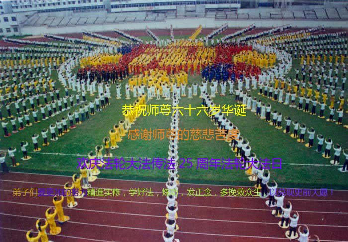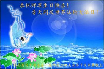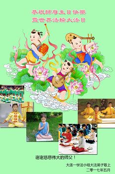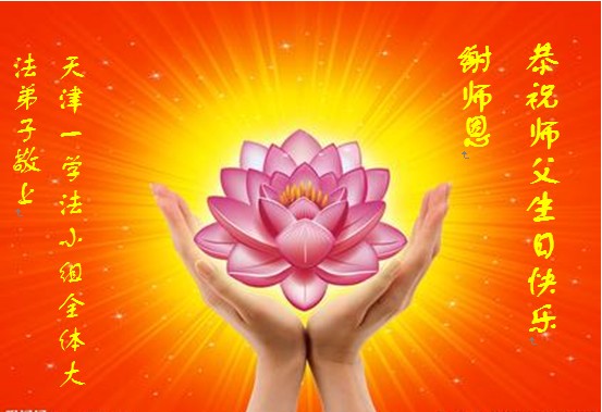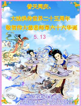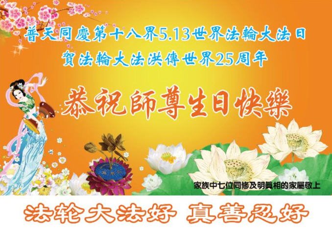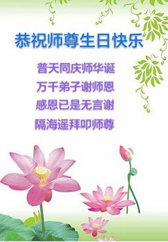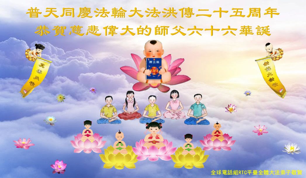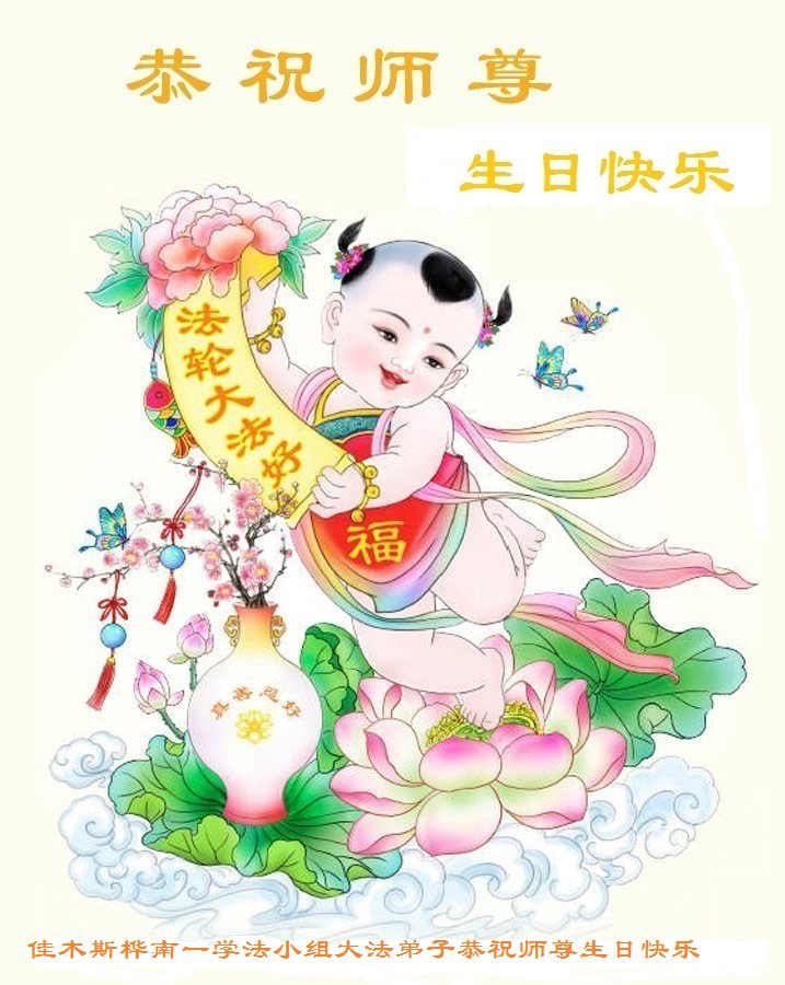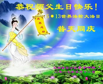 师尊您好!弟子们无法用语言无限感恩师尊的慈悲苦度!叩祝慈悲伟大的师尊生日快乐!并与世界各地各位大法弟子及明真相的世人普天同庆法轮大法洪传二十五周年暨欢庆第十八届世界法轮大法日!