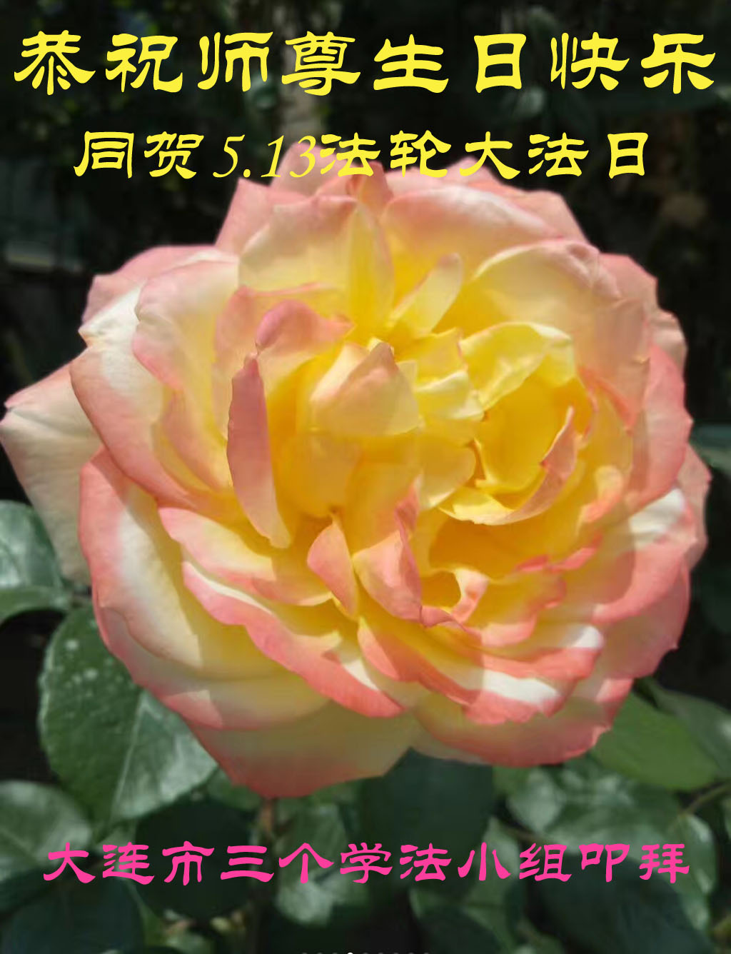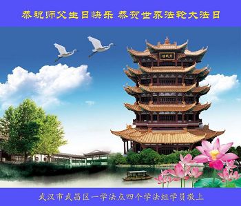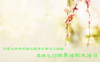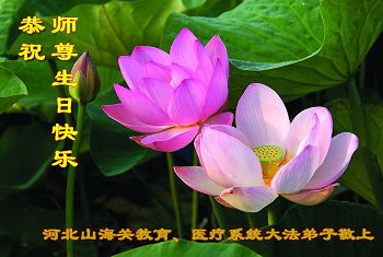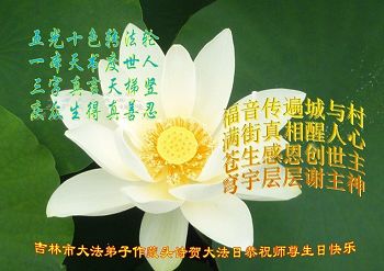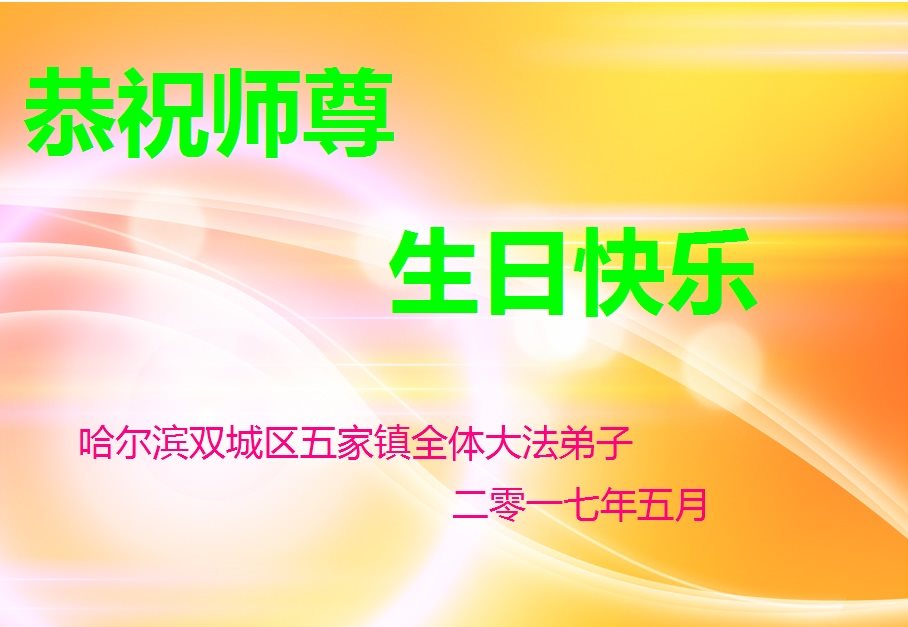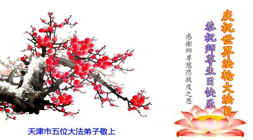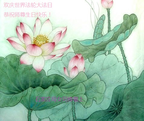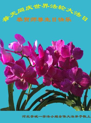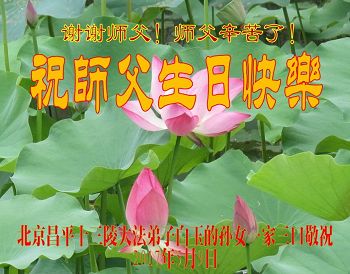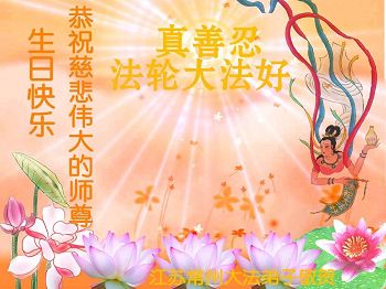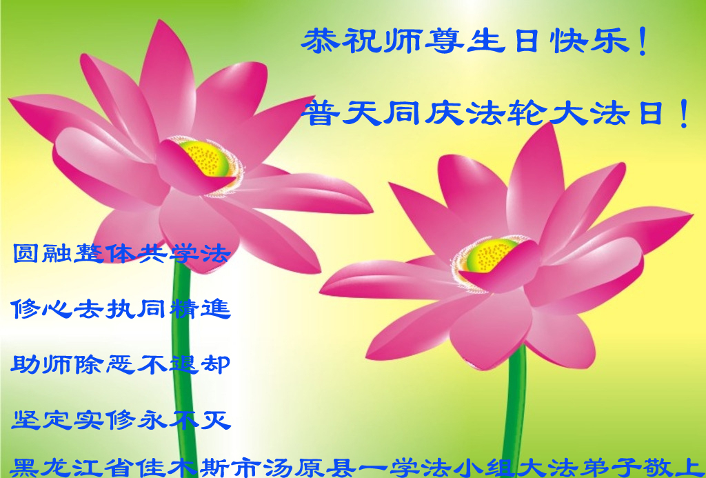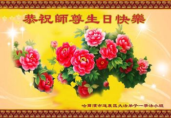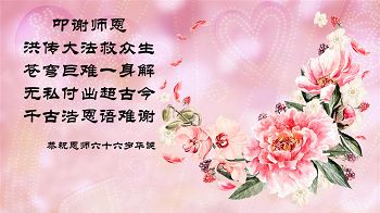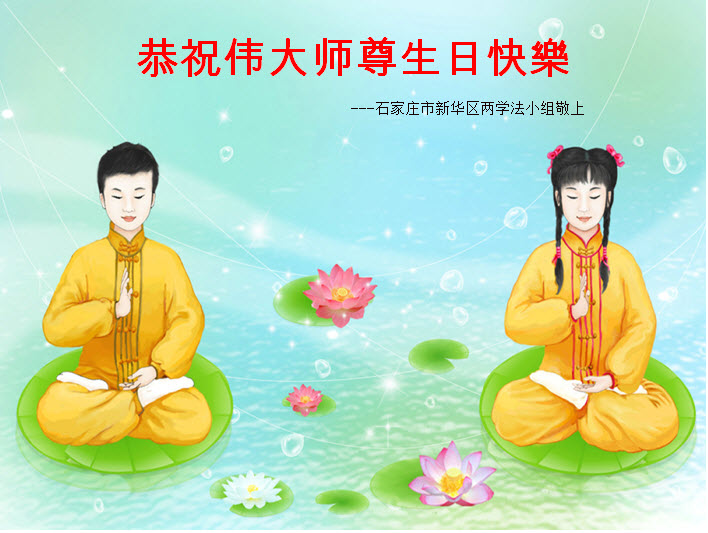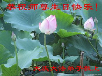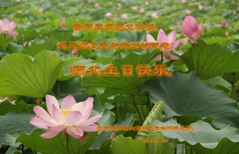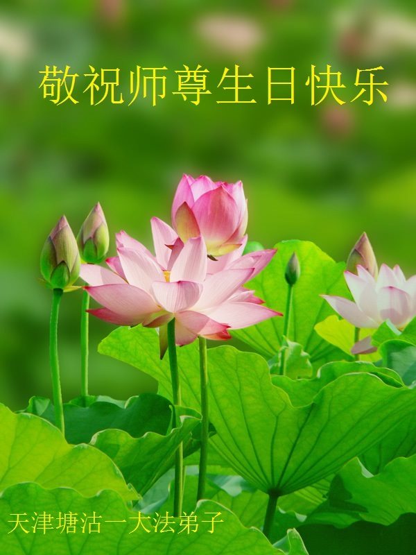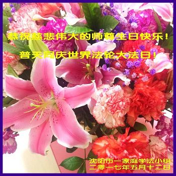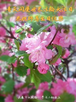 我们学法小组的三位大法弟子是被邪党绑架后,在邪恶的劳教所被迫害时相识的。是师尊的呵护使我们走过了那段日子。值此普天同庆之时,对师尊的感恩无以言表,我们用最虔诚的心恭祝伟大师尊生日快乐!同庆世界法轮大法日!等待师父回国、等待神韵回国演出。