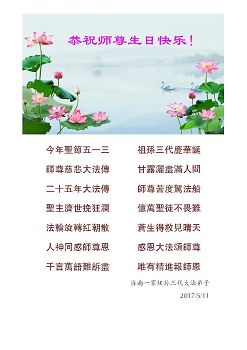 <英文版: http://en.minghui.org/html/articles/2017/5/15/163850.html>明真相世人恭贺世界法轮大法日暨师尊华诞(29条)