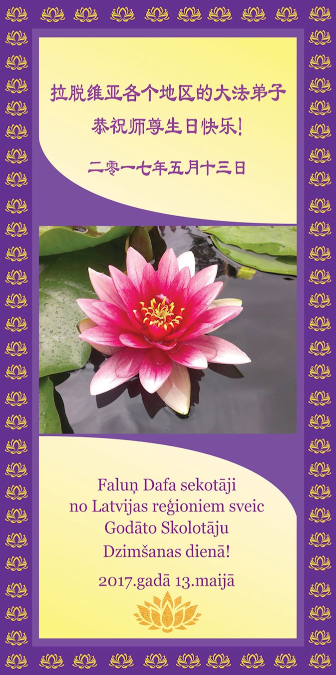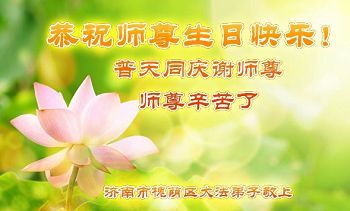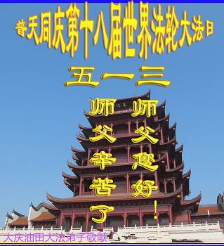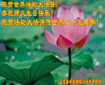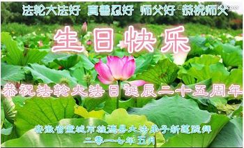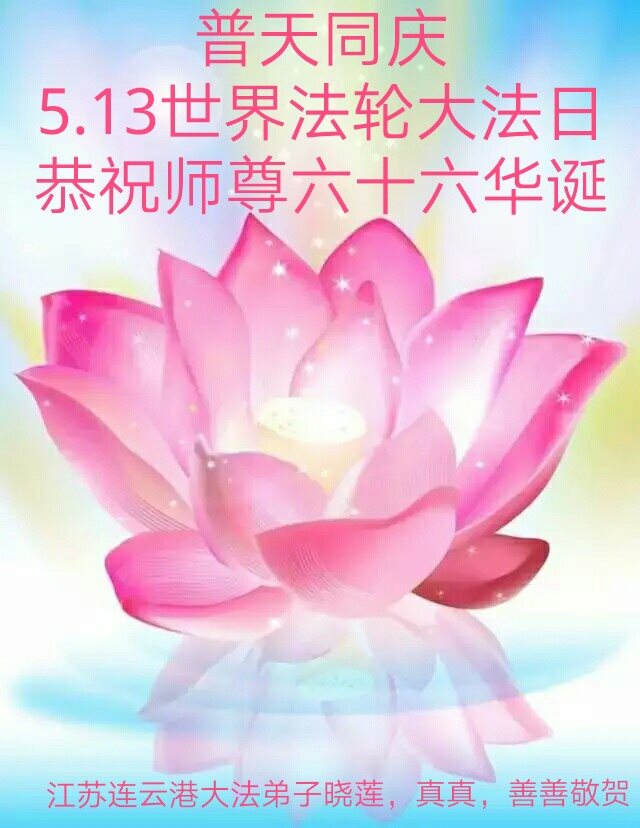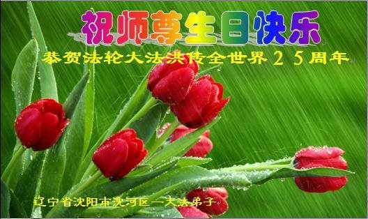 在五月十三日来临之际,我在这里祝贺法轮大法洪传二十五周年,同时祝李老师生日快乐!这二十五年来,万兴能有法轮大法的出现,是真善忍改变了这个世界,让人们真正认识到了什么才是宇宙的真理。然而在中共统治下的中国,却违背人伦,对信仰真善忍的好人无理打压,肆意抓捕、迫害,让这些好人蒙冤,我真心希望天灭中共之日早些到来,早日将这些迫害法轮大法好人的罪犯绳之以法,让他们得到应有的惩罚。
