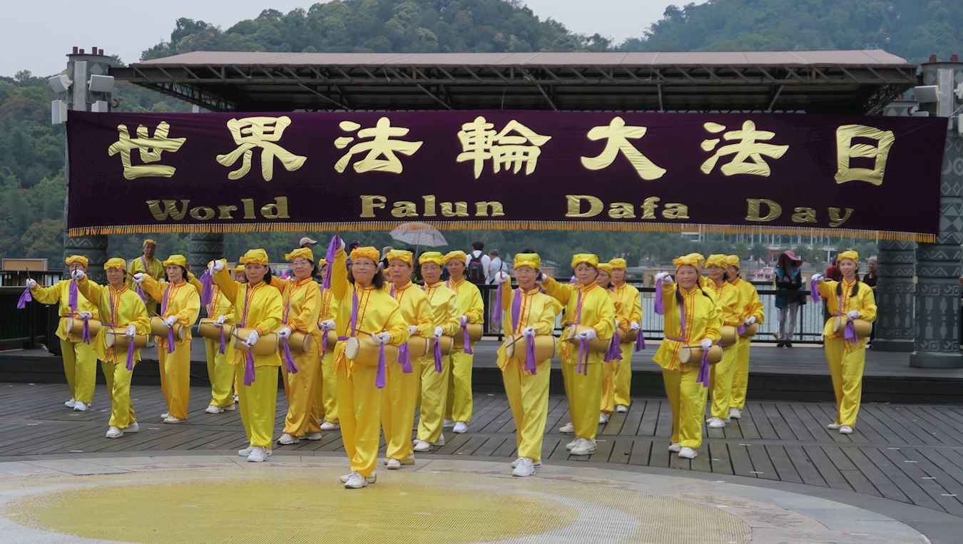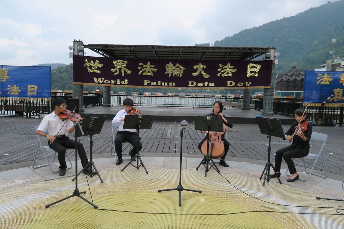 伊达邵码头广场上的庆祝活动,由学员组成的各种鼓乐队、合唱团,小学员的管弦乐、诗歌唱诵,以及功法表演轮番上场,赞颂大法的美好。中外游客循声而来,纷纷拿出手机、相机拍照,有的跟着功法展示学炼起动作,有的接过资料询问相关问题,有的签名声援法轮功。