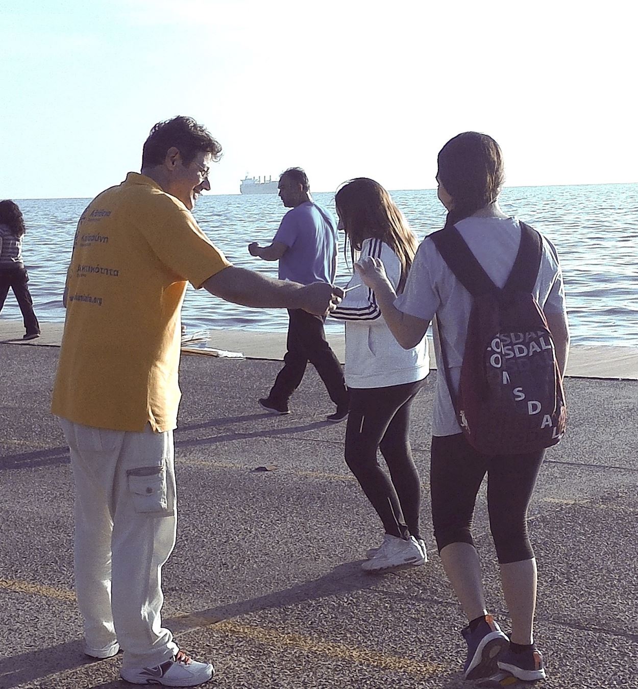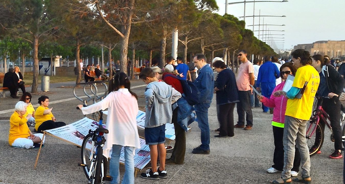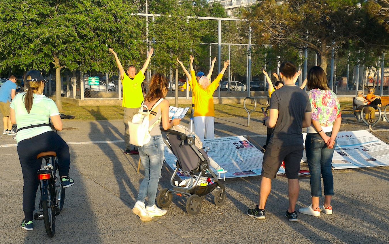 【明慧网二零一七年五月十七日】为了庆祝世界法轮大法日,二零一七年五月十三日希腊北部Thessaloniki学员下午六点半来到海滨大道,那里是人们观看日出日落,散步聚会的景点之一。学员们拉开真相展板,随着柔缓的音乐演示功法。学员们优美的炼功动作吸引了众多散步的游人们前来了解法轮功。