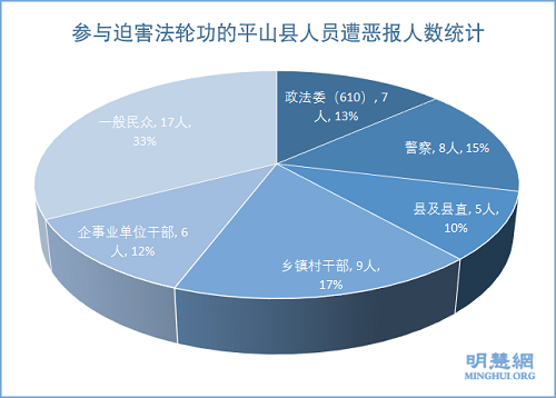 从表1可以看出遭报应者以主导迫害政法委(610)和一线的警察为最多,占28.8℅(15/52);乡、村干部为17.3℅(9/52);企事业单位干部为11.5℅(6/52),一般民众为32.7℅(17/52)。